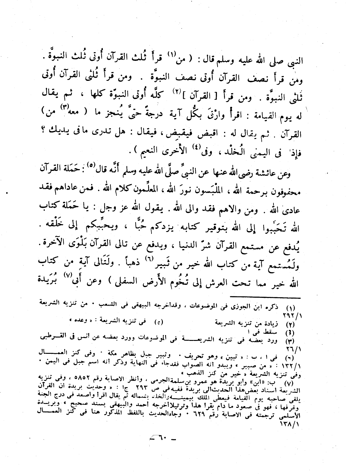 النبى صلى الله عليه وسلم قال: "من قرأَ ثُلث القرآن أُوتى ثُلث النبوَّة. ومن قرأَ نصف القرآن أُوتى نصف النبوَّة. ومن قرأَ ثُلثى القرآن أُوتى ثُلثى النبوَّة. ومن قرأَ [القرآن] كلَّه أُوتى النبوّة كلها، ثم يقال له يوم القيامة: اقرأْ وارْقَ بكُّل آية درجةً حتَّى يُنجز ما (معه من) القرآن. ثم يقال له: اقبض فيقبِض، فيقال: هل تدرى ما فى يديك؟ فإِذا فى اليمنى الخُلْد، وفى الأُخرى النعيم".