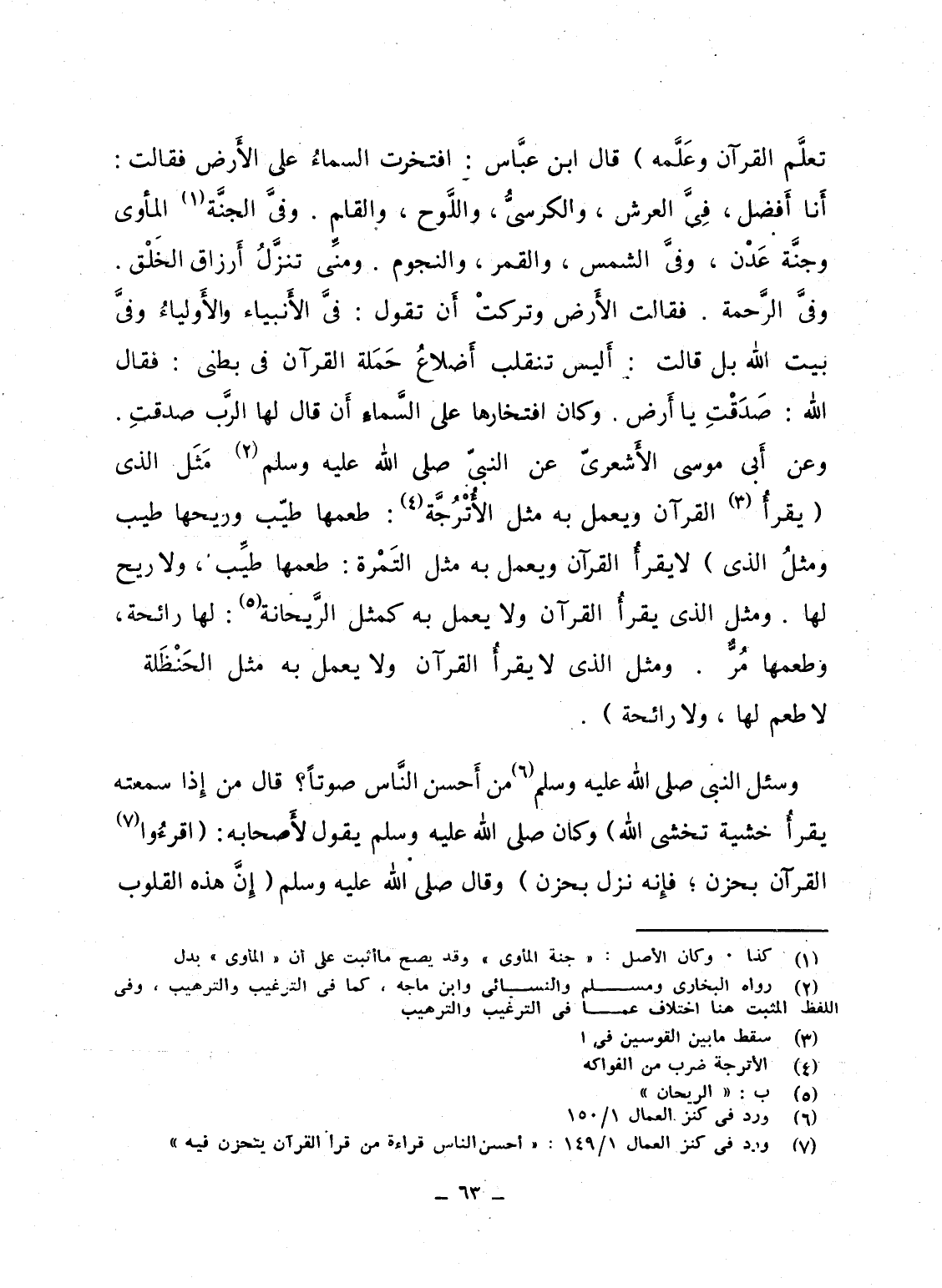 تعلَّم القرآن وعَلَّمه" قال ابن عبَّاس: افتخرت السماءُ على الأَرض فقالت: أَنا أَفضل، فِىَّ العرش، والكرسيُّ، واللَّوح، والقلم. وفيَّ الجنَّة المأوى وجنَّة عَدْن، وفىَّ الشمس، والقمر، والنجوم. ومنِّى تنزَّلُ أَرزاق الخَلْق. وفىَّ الرَّحمة. فقالت الأَرض وتركتْ أَن تقول: فىَّ الأَنبياء والأَولياءُ وفىَّ بيت الله بل قالت: أَليس تنقلب أضلاعُ حَمَلة القرآن فى بطنى: فقال الله: صَدَقْتِ يا أَرض. وكان افتخارها على السَّماءِ أَن قال لها الرَّب صدقتِ. وعن أَبى موسى الأَشعرىّ عن النبىّ صلى الله عليه وسلم مَثَل الذى "يقرأُ القرآن ويعمل به مثل الأُتْرُجَّة: طعمها طيّب وريحها طيب ومثلُ الذى لا يقرأُ القرآن ويعمل به مثل التَمْرة: طعمها طيِّب، ولا ريح لها. ومثل الذى يقرأُ القرآن ولا يعمل به كمثل الرَّيحانة: لها رائحة، وطعمها مُرٌّ. ومثل الذى لا يقرأُ القرآن ولا يعمل به مثل الحَنْظَلة. لا طعم لها، ولا رائحة".