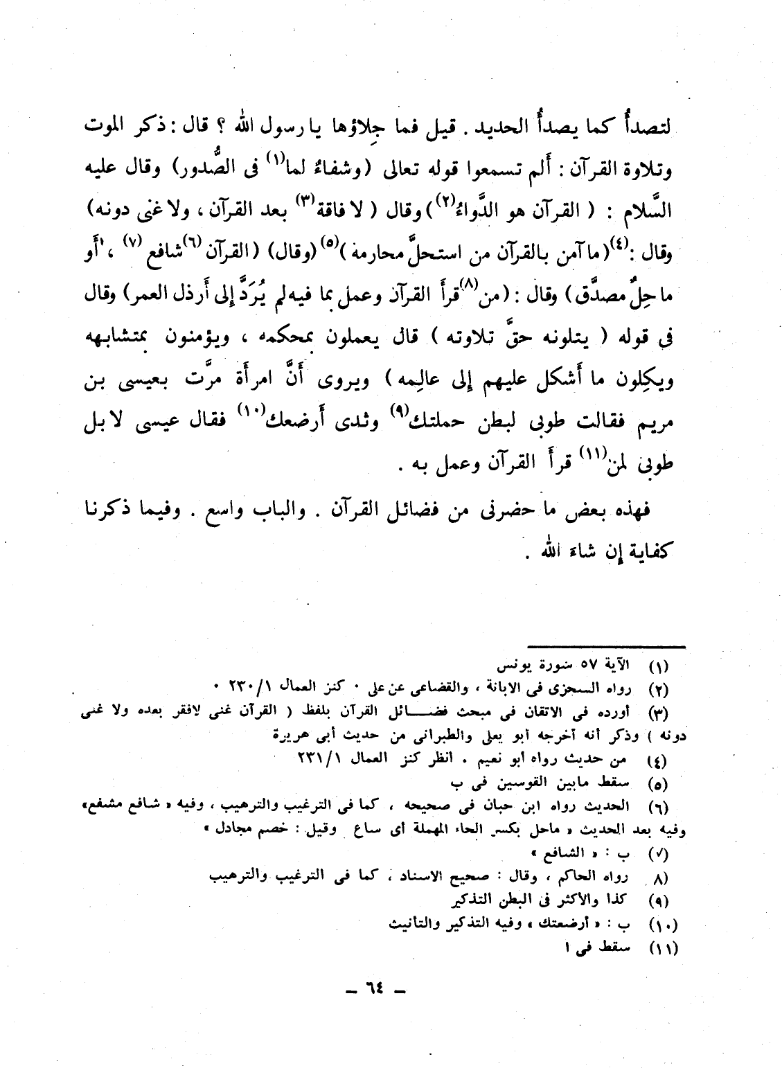 لتصدأُ كما يصدأُ الحديد. قيل فما جِلاؤها يا رسول الله؟ قال: ذكر الموت وتلاوة القرآن: أَلم تسمعوا قوله تعالى {وَشِفَآءٌ لِّمَا فِي الصدور} وقال عليه السَّلام: "القرآن هو الدَّواءُ" وقال "لا فاقة بعد القرآن، ولا غنى دونه" وقال: " ما آمن بالقرآن من استحلَّ محارمه" (وقال) "القرآن شافع، أَو ما حِلٌ مصدَّق" وقال: "من قرأَ القرآن وعمل بما فيه لم يُرَدَّ إِلى أَرذل العمر" وقال فى قوله {يَتْلُونَهُ حَقَّ تِلاَوَتِهِ} قال يعملون بمحكمه، ويؤمنون بمتشابهه ويكِلون ما أَشكل عليهم إِلى عالِمه" ويرى أَنَّ امرأَة مرَّت بعيسى بن مريم فقالت طوبى لبطن حملتك وثدى أَرضعك فقال عيسى لا بل طوبى لمن قرأَ القرآن وعمل به.