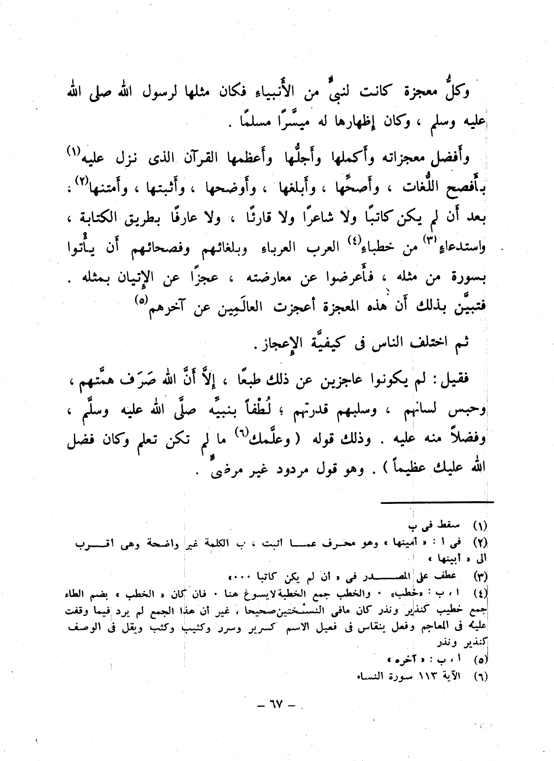 وأَفضل معجزاته وأَكملها وأَجلُّها وأَعظمها القرآن الذى نزل عليه بأَفصح اللُّغات، وأَصحِّها، وأَبلغها، وأَوضحها، وأَثبتها، وأَمتنها، بعد أَن لم يكن كاتباً ولا شاعراً ولا قارئاً، ولا عارفاً بطريق الكتابة، واستدعاءٍ من خطباءِ العرب العرباءِ وبلغائهم وفصحائهم أَن يأْتوا بسورة من مثله، فأَعرضوا عن معارضته، عجزاً عن الإِتيان بمثله، فتبيَّن بذلك أَن هذه المعجزة أعجزت العالَمِين عن آخرهم.