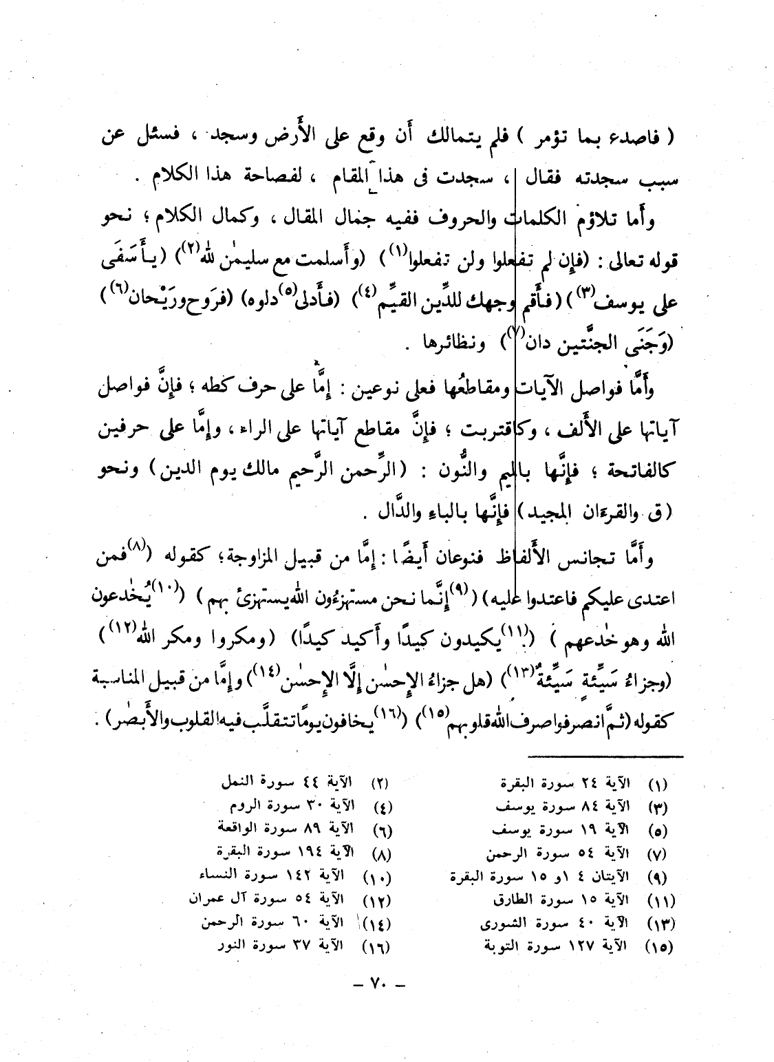 وأَمَّا فواصل الآيات ومقاطعُها فعلى نوعين: إِمَّا على حرف كطه؛ فإِنَّ فواصل آياتها على الأَلف، وكاقتربت؛ فإِنَّ مقاطع آياتها على الراء، وإِمَّا على حرفين كالفاتحة؛ فإِنَّها بالميم والنُّون: {الرحمان الرحيم مالك يَوْمِ الدين} ونحو {ق والقرآن المجيد} فإِنَّها بالباءِ والدَّال.