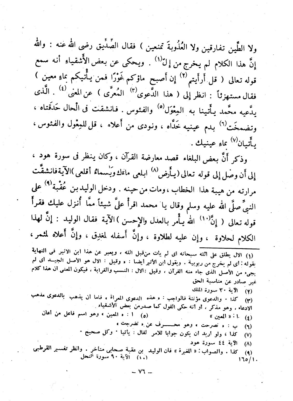 وذكر أَنَّ بعض البلغاء قصد معارضة القرآن، وكان ينظر فى سورة هود، إِلى أَن وصل إِلى قوله تعالى {ياأرض ابلعي مَآءَكِ وياسمآء أَقْلِعِي} الآية فانشقَّت مرارته من هيبة هذا الخطاب، ومات من حينه. ودخل الوليد بن عُقْبة على النبىِّ صلَّى الله عليه وسلم وقال يا محمد اقرأْ علىَّ شيئاً ممَّا أُنزِل عليك فقرأَ قوله تعالى {إِنَّ الله يَأْمُرُ بالعدل والإحسان} الآية فقال الوليد: إِنَّ لهذا الكلام لحلاوة، وإِن عليه لطلاوة، وإِنَّ أَسفله لمغدِق، وإِنَّ أَعلاه لمثمر،