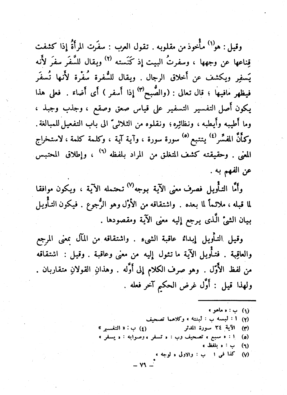 وقيل: هو مأْخوذ من مقلوبه. تقول العرب: سفَرت المرأَةُ إِذا كشفت قِناعها عن وجهها، وسفرتُ إِذ كَنَسته ويقال للسَّفَر سفَر لأَنه يَسِفر ويكشف عن أَخلاق الرجال. ويقال للسُّفرة سُفْرة لأَنها تُسفَر فيظهر ما فيها؛ قال تعالى: {والصبح إِذَآ أَسْفَرَ} أَى أَضاءَ. فعلى هذا يكون أَصل التفسير التسفير على قياس صعق وصقع، وجذب وجبذ، وما أَطيبه وأَيطبه، ونظائِره؛ ونقلوه من الثلاثىّ إلى باب التفعيل للمبالغة. وكأَنَّ المفسِّر يتتبع سورة سورة، وآية آية، وكلمة كلمة، لاستخراج المعنى. وحقيقته كشف المتغلق من المراد بلفظه، وإِطلاق المحتبس عن الفهم به.