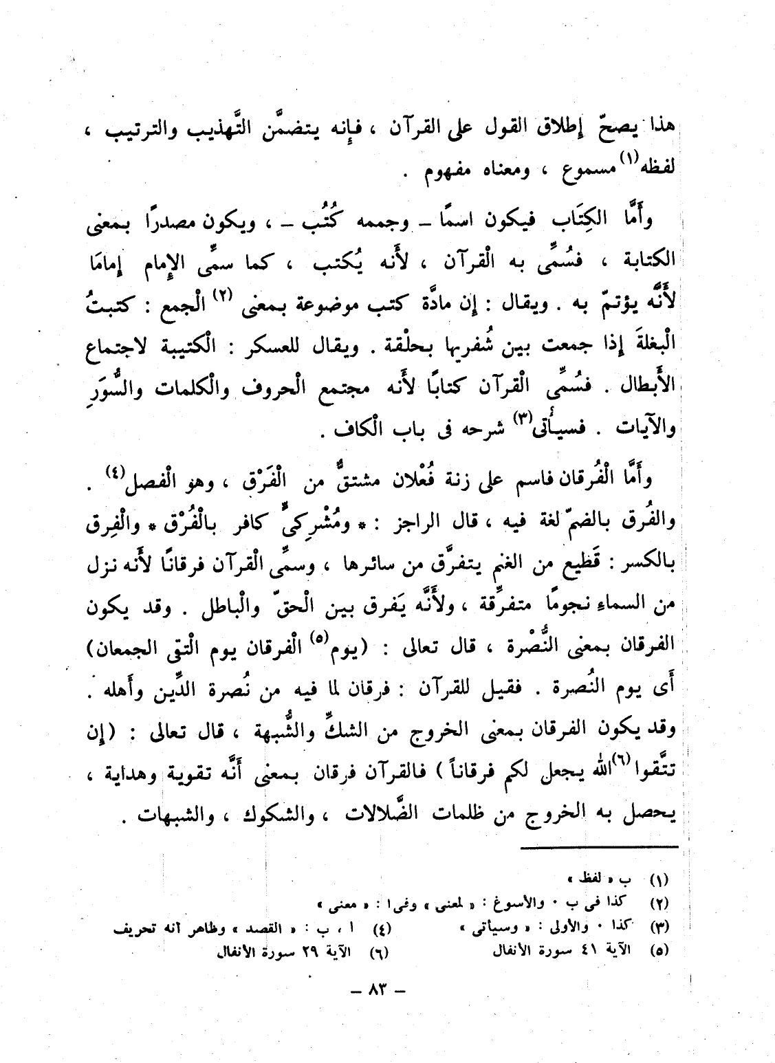 وأَمَّا الْفُرقان فاسم على زنة فُعْلان مشتقٌّ من الْفَرْق، وهو الْفصل. والفُرق بالضمّ لغة فيه، قال الراجز: ومُشْرِكيٍّ كافر بالْفُرْق والْفِرق بالكسر: قَطيع من الغنم يتفرَّق من سائرها، وسمِّى الْقرآن فرقاناً لأَنه نزل من السماءِ نجوماً متفرِّقة، ولأَنَّه يَفرق بين الْحقّ والْباطل. وقد يكون الفرقان بمعنى النُّصْرة، قال تعالى: {يَوْمَ الفرقان يَوْمَ التقى الجمعان} أَى يوم النُصرة. فقيل للقرآن: فرقان لما فيه من نُصرة الدِّين وأَهله. وقد يكون الفرقان بمعنى الخروج من الشكِّ والشُّبهة، قال تعالى: {إِن تَتَّقُواْ الله يَجْعَل لَّكُمْ فُرْقَاناً} فالقرآن فرقان بمعنى أَنَّه تقوية وهداية، يحصل به الخروج من ظلمات الضَّلالات، والشكوك، والشبهات.