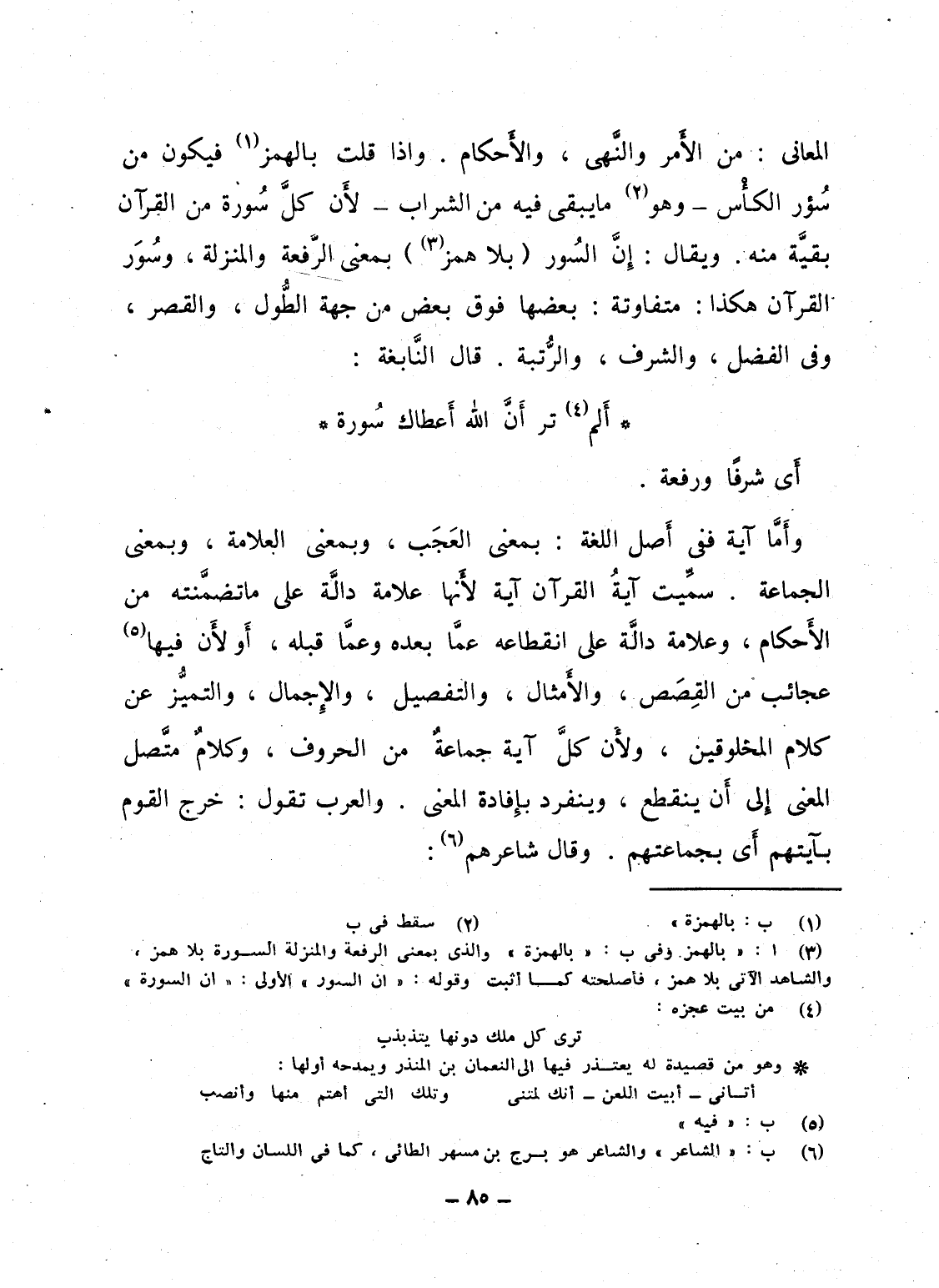وأَمَّا آية ففى أَصل اللغة: بمعنى العَجَب، وبمعنى العلامة، وبمعنى الجماعة. سمِّيت آيةُ القرآن آية لأَنها علامة دالَّة على ما تضمَّنته من الأَحكام، وعلامة دالَّة على انقطاعه عمَّا بعده وعمَّا قبله، أَو لأَن فيها عجائب من القِصَص، والأَمثال، والتفصيل، والإِجمال، والتميُّز عن كلام المخلوقين، ولأن كلَّ آية جماعةٌ من الحروف، وكلامٌ متَّصل المعنى إِلى أَن ينقطع، وينفرد بإِفادة المعنى. والعرب تقول: خرج القوم بآياتهم أَى بجماعتهم. وقال شاعرهم: