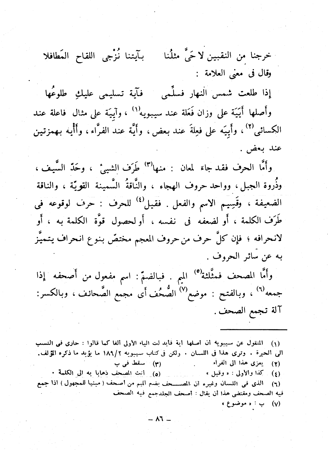 وأَمَّا الحرف فقد جاءَ لمعان: منها طَرَف الشيىء، وحَدّ السَّيف، وذُروة الجبل، وواحد حروف الهجاء، والنَّاقةُ السَّمينة القويّة، والناقة الضعيفة، وقَسِيم الاسم والفعل. فقيل للحرف: حرف لوقوعه فى طَرَف الكلمة، أَو لضعفه فى نفسه، أَو لحصول قوَّة الكلمة به، أَو لانحرافه؛ فإِن كلَّ حرف من حروف المعجم مختصّ بنوع انحراف يتميَّز به عن سائر الحروف.