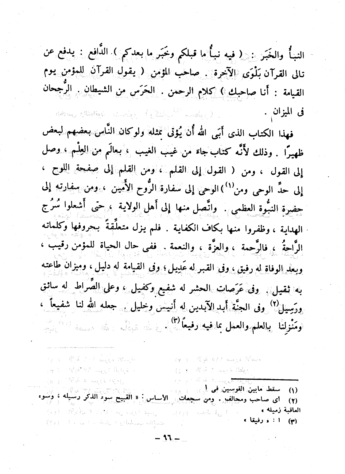 فهذا الكتاب الذى أَبَى الله أَن يُؤتى بمثله ولو كان النَّاس بعضهم لبعض ظهيراً. وذلك لأَنَّه كتاب جاءَ من غيب الغيب، بعالَم من العِلْم، وصل إِلى القول، ومن (القول إِلى القلم، ومن القلم إِلى صفحة اللوح، إِلى حدِّ الوحى ومن) الوحى إِلى سفارة الرُّوح الأَمين، ومن سفارته إِلى حضرة النبُّوة العظمى. واتَّصل منها إِلى أَهل الولاية، حتى أَشعلوا سُرُج الهداية، وظفروا منها بكاف الكفاية، فلم يزل متعلِّقةً بحروفها وكلماته الرَّاحةُ، فالرَّحمة، والعزَّة، والنعمة، ففي حال الحياة للمؤمن رقيب، وبعد الوفاة له رفيق، وفى القبر له عَدِيل؛ وفى القيامة له دليل، وميزان طاعته به ثقيل. وفى عَرَصات الحشر له شفيع وكفيل، وعلى الصِّراط له سائق ورَسِيل وفى الجنَّة أَبد الآبدين له أَنيس وخليل. جعله الله لنا شفيعاً، ومَنْزِلنا بالعلم والعمل بما فيه رفيعاً.