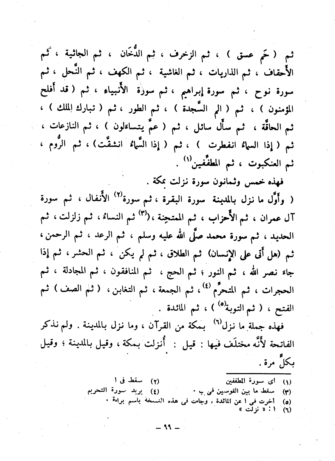 فهذه جملة ما نزل بمكة من القرآن، وما نزل بالمدينة. ولم نذكر الفاتحة لأَنَّه مختلَف فيها: أُنزلت بمكة، وقيل بالمدينة؛ وقيل بكلٍّ مرة.