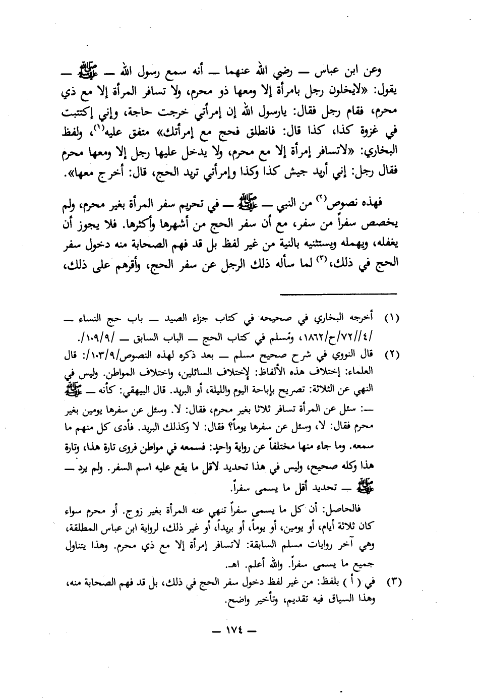 فَهَذِهِ نُصُوصٌ مِنَ النَّبِيِّ - صَلَّى اللَّهُ عَلَيْهِ وَسَلَّمَ - فِي تَحْرِيمِ سَفَرِ الْمَرْأَةِ بِغَيْرِ مَحْرَمٍ، وَلَمْ يُخَصِّصْ سَفَرًا مِنْ سَفَرٍ، مَعَ أَنَّ سَفَرَ الْحَجِّ مِنْ أَشْهَرِهَا وَأَكْثَرِهَا. فَلَا يَجُوزُ أَنْ يُغْفِلَهُ، وَيُهْمِلَهُ وَيَسْتَثْنِيَهُ بِالنِّيَّةِ مِنْ غَيْرِ لَفْظٍ، بَلْ قَدْ فَهِمَ الصَّحَابَةُ مِنْهُ دُخُولَ سَفَرِ الْحَجِّ فِي ذَلِكَ لَمَّا سَأَلَهُ ذَلِكَ الرَّجُلُ عَنْ سَفَرِ الْحَجِّ، وَأَقَرَّهُمْ عَلَى ذَلِكَ،