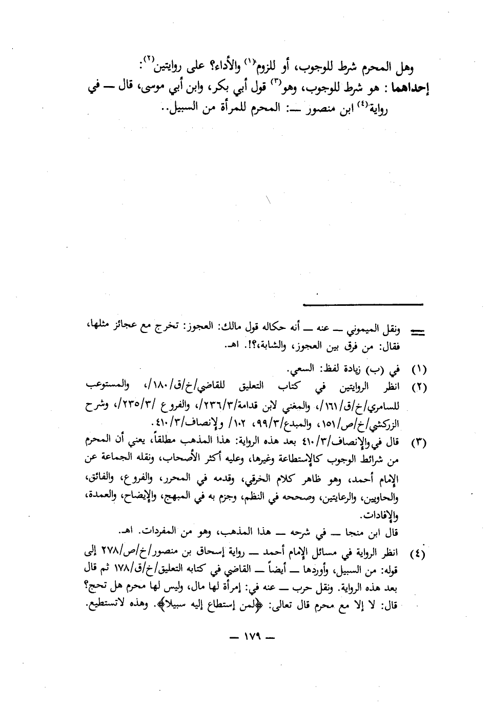إِحْدَاهُمَا: هُوَ شَرْطٌ لِلْوُجُوبِ، وَهُوَ قَوْلُ أَبِي بَكْرٍ، وَابْنُ أَبِي مُوسَى قَالَ - فِي رِوَايَةِ ابْنِ مَنْصُورٍ -: الْمَحْرَمُ لِلْمَرْأَةِ مِنَ السَّبِيلِ ... .