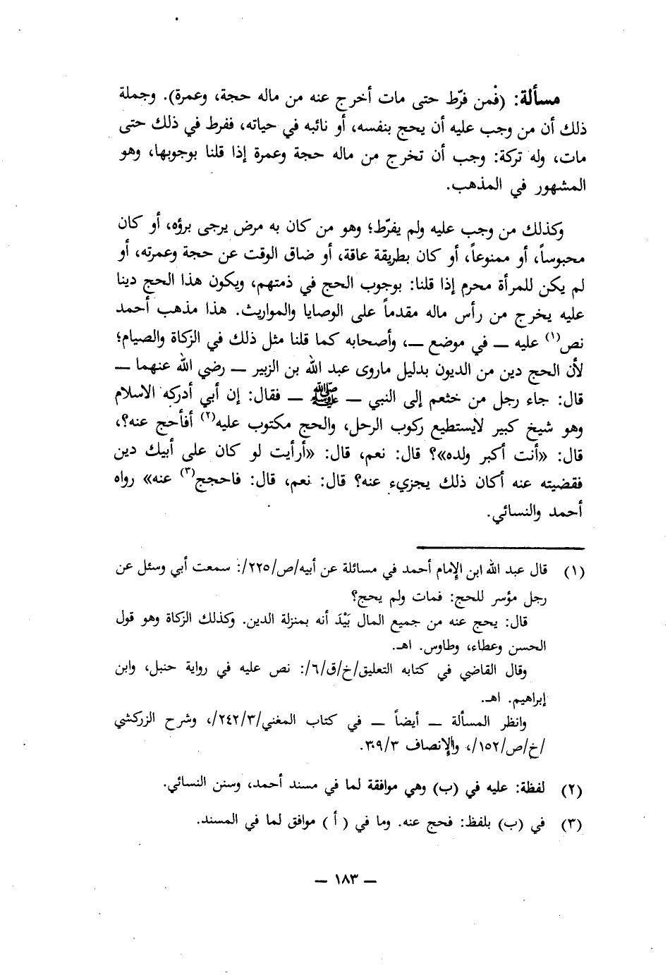 وَكَذَلِكَ مَنْ وَجَبَ عَلَيْهِ وَلَمْ يُفَرِّطْ؛ وَهُوَ مَنْ كَانَ بِهِ مَرَضٌ يُرْجَى بُرْؤُهُ، أَوْ كَانَ مَحْبُوسًا، أَوْ مَمْنُوعًا، أَوْ كَانَ بِطَرِيقَةٍ عَاقَةٍ، أَوْ ضَاقَ الْوَقْتُ عَنْ حَجِّهِ وَعُمْرَتِهِ، أَوْ لَمْ يَكُنْ لِلْمَرْأَةِ مَحْرَمٌ إِذَا قُلْنَا بِوُجُوبِ الْحَجِّ فِي ذِمَّتِهِمْ، وَيَكُونُ هَذَا الْحَجُّ دَيْنًا عَلَيْهِ يُخْرَجُ مِنْ رَأْسِ مَالِهِ مُقَدَّمًا عَلَى الْوَصَايَا وَالْمَوَارِيثِ. هَذَا مَذْهَبُ أَحْمَدَ، نَصَّ عَلَيْهِ - فِي مَوْضِعٍ - وَأَصْحَابِهِ، كَمَا قُلْنَا مِثْلَ ذَلِكَ فِي الزَّكَاةِ وَالصِّيَامِ؛ لِأَنَّ الْحَجَّ دَيْنٌ مِنَ الدُّيُونِ، بِدَلِيلِ مَا رَوَى عَبْدُ اللَّهِ بْنُ الزُّبَيْرِ - رَضِيَ اللَّهُ عَنْهُمَا - قَالَ: «جَاءَ رَجُلٌ مِنْ خَثْعَمَ إِلَى النَّبِيِّ - صَلَّى اللَّهُ عَلَيْهِ وَسَلَّمَ - فَقَالَ: إِنَّ أَبِي أَدْرَكَهُ الْإِسْلَامُ، وَهُوَ شَيْخٌ كَبِيرٌ لَا يَسْتَطِيعُ رُكُوبَ الرَّحْلِ، وَالْحَجُّ مَكْتُوبٌ عَلَيْهِ أَفَأَحُجُّ عَنْهُ؟ قَالَ: (أَنْتَ أَكْبَرُ وَلَدِهِ؟) قَالَ: نَعَمْ، قَالَ: (أَرَأَيْتَ لَوْ كَانَ عَلَى أَبِيكَ دَيْنٌ فَقَضَيْتَهُ عَنْهُ أَكَانَ ذَلِكَ يُجْزِئُ عَنْهُ؟ قَالَ: نَعَمْ، قَالَ: فَاحْجُجْ عَنْهُ»). رَوَاهُ أَحْمَدُ وَالنَّسَائِيُّ.