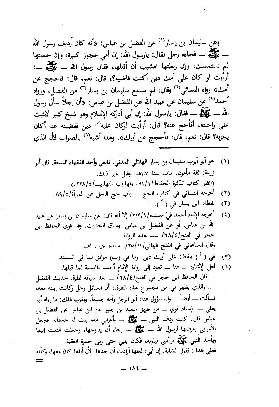 وَعَنْ سُلَيْمَانَ بْنِ يَسَارٍ، عَنِ الْفَضْلِ بْنِ عَبَّاسٍ: («أَنَّهُ كَانَ رَدِيفَ رَسُولِ اللَّهِ - صَلَّى اللَّهُ عَلَيْهِ وَسَلَّمَ - فَجَاءَهُ رَجُلٌ، فَقَالَ: يَا رَسُولَ اللَّهِ، إِنَّ أُمِّي عَجُوزٌ كَبِيرَةٌ، وَإِنْ حَمَلْتُهَا لَمْ تَسْتَمْسِكْ، وَإِنْ رَبَطْتُهَا خَشِيتُ أَنْ أَقْتُلَهَا، فَقَالَ رَسُولُ اللَّهِ - صَلَّى اللَّهُ عَلَيْهِ وَسَلَّمَ -: (أَرَأَيْتَ لَوْ كَانَ عَلَى أُمِّكَ دَيْنٌ أَكُنْتَ قَاضِيَهُ؟ قَالَ: نَعَمْ، قَالَ: فَاحْجُجْ عَنْ أُمِّكَ»). رَوَاهُ النَّسَائِيُّ، وَقَالَ: لَمْ يَسْمَعْ سُلَيْمَانُ بْنُ يَسَارٍ مِنَ الْفَضْلِ، وَرَوَاهُ أَحْمَدُ عَنْ سُلَيْمَانَ، عَنْ عُبَيْدِ اللَّهِ، عَنِ الْفَضْلِ بْنِ عَبَّاسٍ: («أَنَّ رَجُلًا سَأَلَ رَسُولَ اللَّهِ - صَلَّى اللَّهُ عَلَيْهِ وَسَلَّمَ - فَقَالَ: يَا رَسُولَ اللَّهِ، إِنَّ أَبِي أَدْرَكَهُ الْإِسْلَامُ وَهُوَ شَيْخٌ كَبِيرٌ لَا يَثْبُتُ عَلَى رَاحِلَتِهِ، أَفَأَحُجُّ عَنْهُ؟ قَالَ: أَرَأَيْتَ لَوْ كَانَ عَلَيْهِ دَيْنٌ فَقَضَيْتَهُ عَنْهُ أَكَانَ يُجْزِيهِ؟ قَالَ: نَعَمْ، قَالَ: فَاحْجُجْ عَنْ أَبِيكَ»). وَهَذَا أَشْبَهُ بِالصَّوَابِ؛ لِأَنَّ الَّذِي