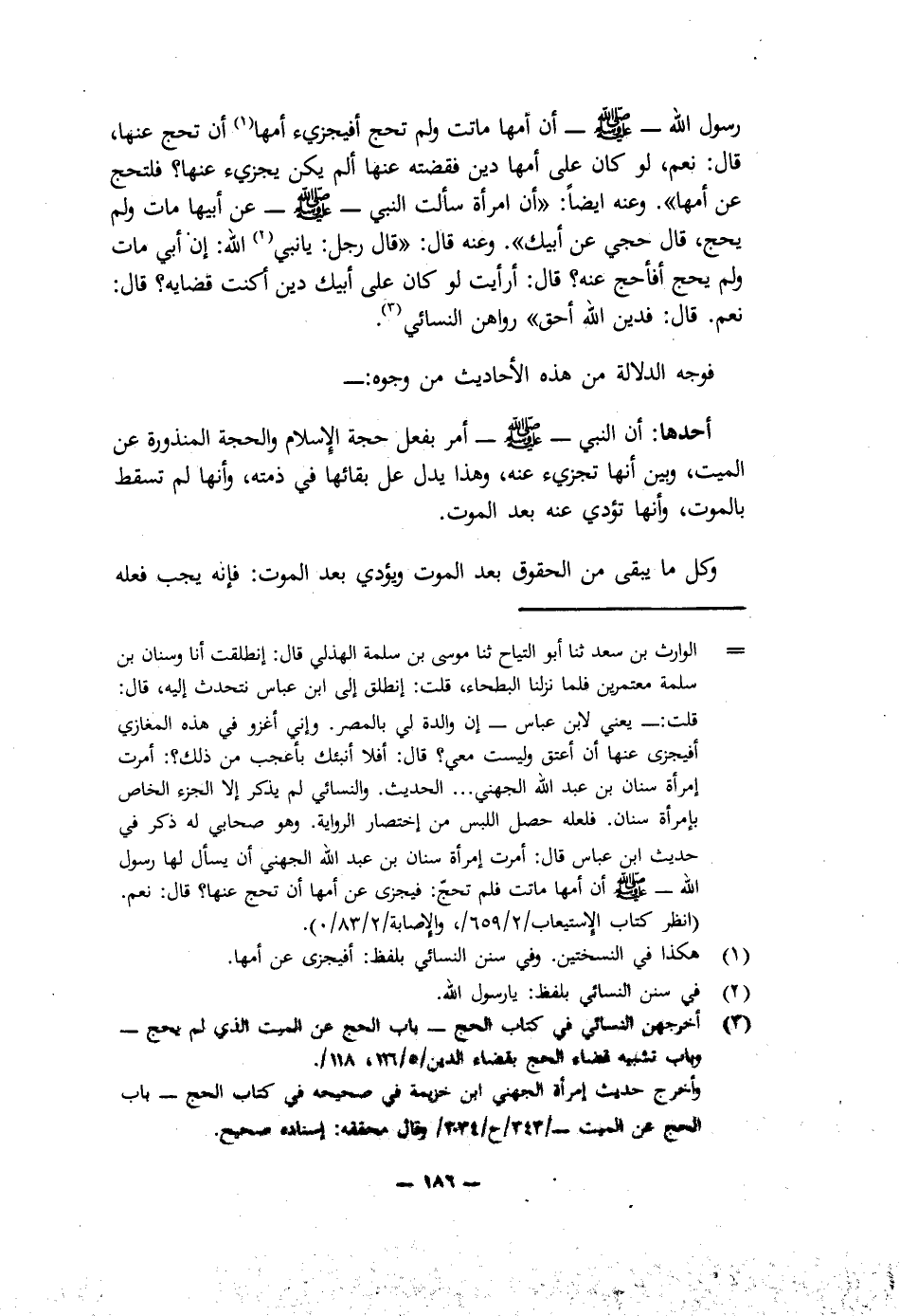 رَسُولَ اللَّهِ - صَلَّى اللَّهُ عَلَيْهِ وَسَلَّمَ - أَنَّ أُمَّهَا مَاتَتْ وَلَمْ تَحُجَّ أَفَيُجْزِئُ أُمَّهَا أَنْ تَحُجَّ عَنْهَا؟ قَالَ: نَعَمْ، لَوْ كَانَ عَلَى أُمِّهَا دَيْنٌ فَقَضَتْهُ عَنْهَا أَلَمْ يَكُنْ يُجْزِئُ عَنْهَا؟ فَلْتَحُجَّ عَنْ أُمِّهَا»). وَعَنْهُ أَيْضًا: («أَنَّ امْرَأَةً سَأَلَتِ النَّبِيَّ - صَلَّى اللَّهُ عَلَيْهِ وَسَلَّمَ - عَنْ أَبِيهَا مَاتَ وَلَمْ يَحُجَّ، قَالَ: حُجِّي عَنْ أَبِيكِ»). وَعَنْهُ قَالَ: («قَالَ رَجُلٌ: يَا نَبِيَّ اللَّهِ، إِنَّ أَبِي مَاتَ وَلَمْ يَحُجَّ أَفَأَحُجُّ عَنْهُ؟ قَالَ: أَرَأَيْتَ لَوْ كَانَ عَلَى أَبِيكَ دَيْنٌ أَكُنْتَ قَاضِيَهُ؟ قَالَ: نَعَمْ، قَالَ: فَدَيْنُ اللَّهِ أَحَقُّ»). رَوَاهُنَّ النَّسَائِيُّ.