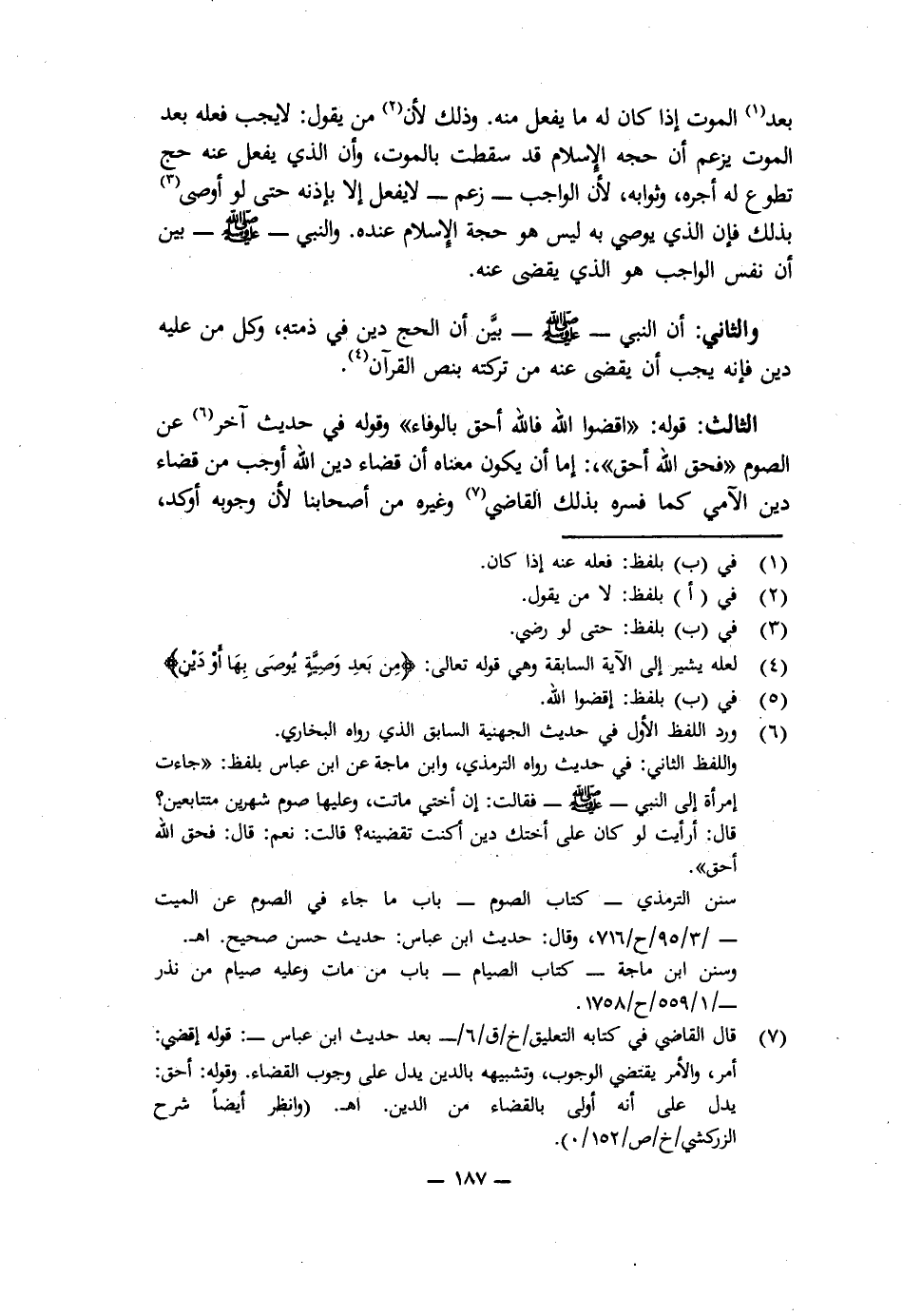 بَعْدَ الْمَوْتِ إِذَا كَانَ لَهُ مَا يَفْعَلُ مِنْهُ، وَذَلِكَ لِأَنَّ مَنْ يَقُولُ: لَا يَجِبْ فِعْلُهُ بَعْدَ الْمَوْتِ يَزْعُمُ أَنَّ حَجَّةَ الْإِسْلَامِ قَدْ سَقَطَتْ بِالْمَوْتِ، وَأَنَّ الَّذِي يُفْعَلُ عَنْهُ حَجُّ تَطَوُّعٍ لَهُ أَجْرُهُ، وَثَوَابُهُ؛ لِأَنَّ الْوَاجِبَ - زَعْمٌ - لَا يُفْعَلُ إِلَّا بِإِذْنِهِ حَتَّى لَوْ أَوْصَى بِذَلِكَ فَإِنَّ الَّذِي يُوصَى بِهِ لَيْسَ هُوَ حَجَّةَ الْإِسْلَامِ عِنْدَهُ، وَالنَّبِيُّ - صَلَّى اللَّهُ عَلَيْهِ وَسَلَّمَ - بَيَّنَ أَنَّ نَفْسَ الْوَاجِبِ هُوَ الَّذِي يُقْضَى عَنْهُ.