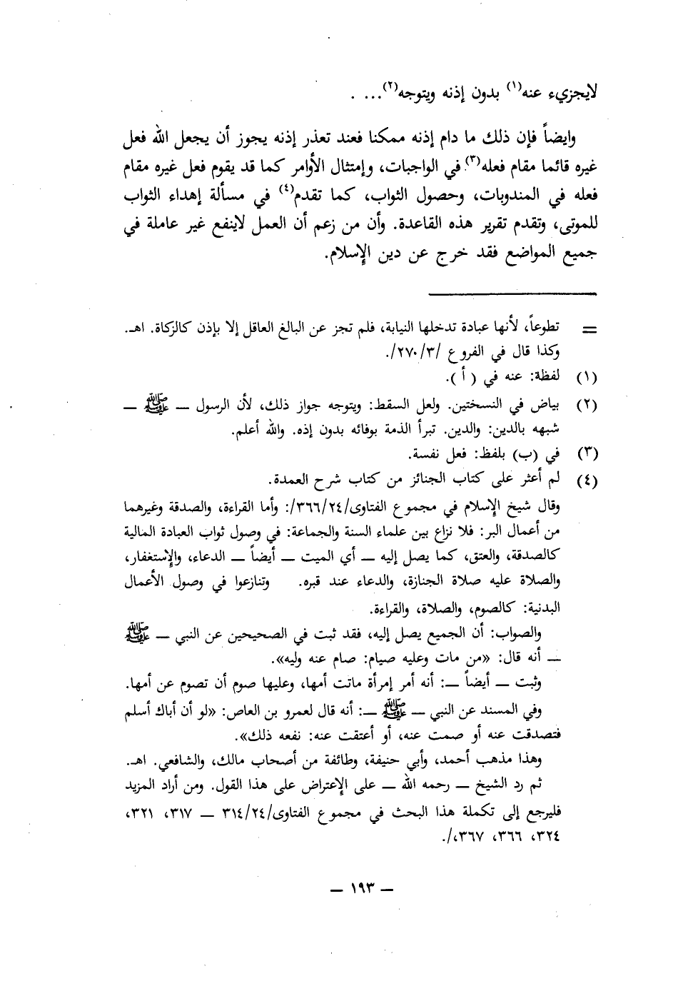 وَأَيْضًا فَإِنَّ ذَلِكَ مَا دَامَ إِذْنُهُ مُمْكِنًا فَعِنْدَ تَعَذُّرِ إِذْنِهِ يَجُوزُ أَنْ يَجْعَلَ اللَّهُ فِعْلَ غَيْرِهِ قَائِمًا مَقَامَ فِعْلِهِ فِي الْوَاجِبَاتِ، وَامْتِثَالِ الْأَوَامِرِ كَمَا قَدْ يَقُومُ فِعْلُ غَيْرِهِ مَقَامَ فِعْلِهِ فِي الْمَنْدُوبَاتِ، وَحُصُولِ الثَّوَابِ كَمَا تَقَدَّمَ فِي مَسْأَلَةِ إِهْدَاءِ الثَّوَابِ لِلْمَوْتَى، وَتَقَدَّمَ تَقْرِيرُ هَذِهِ الْقَاعِدَةِ، وَأَنَّ مَنْ زَعَمَ أَنَّ الْعَمَلَ لَا يَنْفَعُ غَيْرَ عَامِلِهِ فِي جَمِيعِ الْمَوَاضِعِ فَقَدْ خَرَجَ عَنْ دِينِ الْإِسْلَامِ.
