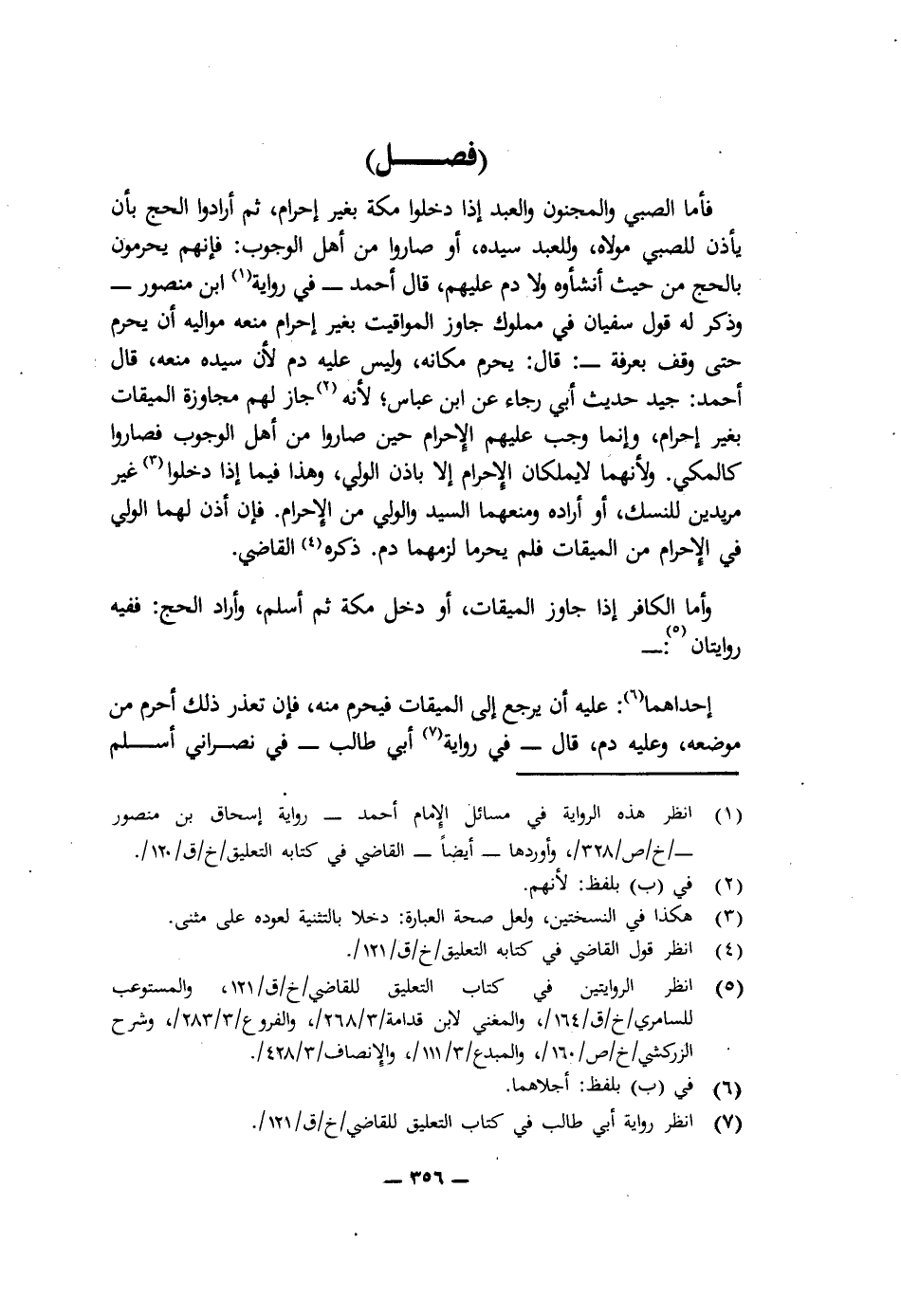 فَأَمَّا الصَّبِيُّ وَالْمَجْنُونُ وَالْعَبْدُ إِذَا دَخَلُوا مَكَّةَ بِغَيْرِ إِحْرَامٍ، ثُمَّ أَرَادُوا الْحَجَّ بِأَنْ يَأْذَنَ لِلصَّبِيِّ مَوْلَاهُ، وَلِلْعَبْدِ سَيِّدُهُ، أَوْ صَارُوا مِنْ أَهْلِ الْوُجُوبِ فَإِنَّهُمْ يُحْرِمُونَ بِالْحَجِّ مِنْ حَيْثُ أَنْشَئُوهُ وَلَا دَمَ عَلَيْهِمْ، قَالَ أَحْمَدُ فِي رِوَايَةِ ابْنِ مَنْصُورٍ وَذُكِرَ لَهُ قَوْلُ سُفْيَانَ فِي مَمْلُوكٍ جَاوَزَ الْمَوَاقِيتَ بِغَيْرِ إِحْرَامٍ مَنَعَهُ مَوَالِيهِ أَنْ يُحْرِمَ حَتَّى وَقَفَ بِعَرَفَةَ، قَالَ: يُحْرِمُ مَكَانَهُ وَلَيْسَ عَلَيْهِ دَمٌ لِأَنَّ سَيِّدَهُ مَنَعَهُ، قَالَ أَحْمَدُ: جَيِّدٌ حَدِيثُ أَبِي رَجَاءٍ عَنِ ابْنِ عَبَّاسٍ؛ لِأَنَّهُ جَازَ لَهُمْ مُجَاوَزَةُ الْمِيقَاتِ بِغَيْرِ إِحْرَامٍ، وَإِنَّمَا وَجَبَ عَلَيْهِمُ الْإِحْرَامُ حِينَ صَارُوا مِنْ أَهْلِ الْوُجُوبِ فَصَارُوا كَالْمَكِّيِّ، وَلِأَنَّهُمَا لَا يَمْلِكَانِ الْإِحْرَامَ إِلَّا بِإِذْنِ الْوَلِيِّ، وَهَذَا فِيمَا إِذَا دَخَلُوا غَيْرَ مُرِيدِينَ لِلنُّسُكِ، أَوْ أَرَادَهُ وَمَنَعَهُمَا السَّيِّدُ وَالْوَلِيُّ مِنَ الْإِحْرَامِ، فَإِنْ أَذِنَ لَهُمَا الْوَلِيُّ فِي الْإِحْرَامِ مِنَ الْمِيقَاتِ فَلَمْ يُحْرِمَا لَزِمَهُمَا دَمٌ، ذَكَرَهُ الْقَاضِي.
