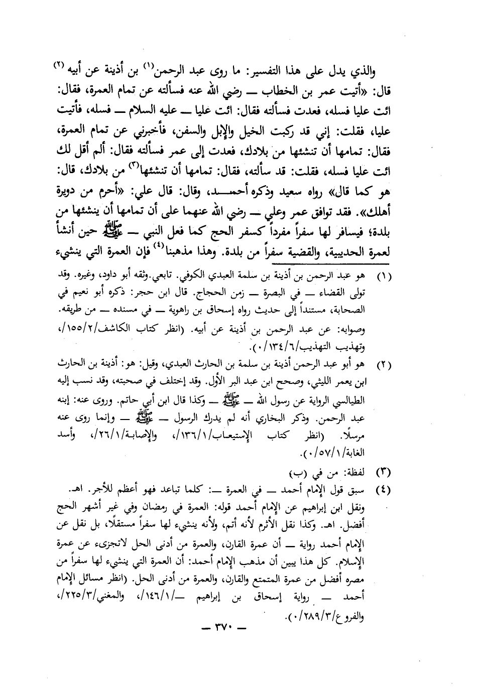 وَالَّذِي يَدُلُّ عَلَى هَذَا التَّفْسِيرِ مَا رَوَى عَبْدُ الرَّحْمَنِ بْنُ أُذَيْنَةَ عَنْ أَبِيهِ قَالَ: " أَتَيْتُ عُمَرَ بْنَ الْخَطَّابِ رَضِيَ اللَّهُ عَنْهُ فَسَأَلْتُهُ عَنْ تَمَامِ الْعُمْرَةِ فَقَالَ: ائْتِ عَلِيًّا فَسَلْهُ فَعُدْتُ فَسَأَلْتُهُ فَقَالَ: ائْتِ عَلِيًّا عَلَيْهِ السَّلَامُ فَسَلْهُ، فَأَتَيْتُ عَلِيًّا فَقُلْتُ: إِنِّي قَدْ رَكِبْتُ الْخَيْلَ وَالْإِبِلَ وَالسُّفُنَ، فَأَخْبِرْنِي عَنْ تَمَامِ الْعُمْرَةِ فَقَالَ: تَمَامُهَا أَنْ تُنْشِئَهَا مِنْ بِلَادِكَ، فَعُدْتُ إِلَى عُمَرَ فَسَأَلْتُهُ فَقَالَ: أَلَمْ أَقُلْ لَكَ: ائْتِ عَلِيًّا فَسَلْهُ، فَقُلْتُ: قَدْ سَأَلْتُهُ فَقَالَ: تَمَامُهَا أَنْ تُنْشِئَهَا مِنْ بِلَادِكَ، قَالَ: هُوَ كَمَا قَالَ " رَوَاهُ سَعِيدٌ وَذَكَرَهُ أَحْمَدُ، وَقَالَ: قَالَ عَلِيٌّ: " أَحْرِمْ مِنْ دُوَيْرَةِ أَهْلِكَ " فَقَدْ تَوَافَقَ عُمَرُ وَعَلِيٌّ رَضِيَ اللَّهُ عَنْهُمَا عَلَى أَنَّ تَمَامَهَا أَنْ يُنْشِئَهَا مِنْ بَلَدِهِ، فَيُسَافِرَ لَهَا سَفَرًا مُفْرَدًا كَسَفَرِ الْحَجِّ كَمَا فَعَلَ النَّبِيُّ - صَلَّى اللَّهُ عَلَيْهِ وَسَلَّمَ - حِينَ أَنْشَأَ لِعُمْرَةِ الْحُدَيْبِيَةِ وَالْقَضِيَّةِ سَفَرًا مِنْ بَلَدِهِ، وَهَذَا مَذْهَبُنَا فَإِنَّ الْعُمْرَةَ الَّتِي يُنْشِئُ