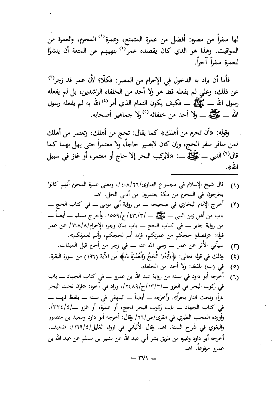 فَأَمَّا أَنْ يُرَادَ بِهِ الدُّخُولُ فِي الْإِحْرَامِ مِنَ الْمِصْرِ فَكَلَّا؛ لِأَنَّ عُمَرَ قَدْ زَجَرَ عَنْ ذَلِكَ، وَعَلِيٌّ لَمْ يَفْعَلْهُ قَطُّ هُوَ وَلَا أَحَدٌ مِنَ الْخُلَفَاءِ الرَّاشِدِينَ، بَلْ لَمْ يَفْعَلْهُ رَسُولُ اللَّهِ - صَلَّى اللَّهُ عَلَيْهِ وَسَلَّمَ - فَكَيْفَ يَكُونُ التَّمَامُ الَّذِي أَمَرَ اللَّهُ بِهِ لَمْ يَفْعَلْهُ رَسُولُ اللَّهِ - صَلَّى اللَّهُ عَلَيْهِ وَسَلَّمَ - وَلَا أَحَدٌ مِنْ خُلَفَائِهِ وَلَا جَمَاهِيرُ أَصْحَابِهِ.