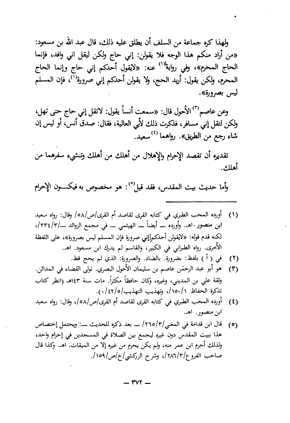 وَلِهَذَا كَرِهَ جَمَاعَةٌ مِنَ السَّلَفِ أَنْ يُطْلَقَ عَلَيْهِ ذَلِكَ، قَالَ عَبْدُ اللَّهِ بْنُ مَسْعُودٍ: " مَنْ أَرَادَ مِنْكُمْ هَذَا الْوَجْهَ فَلَا يَقُولَنَّ: إِنِّي حَاجٌّ وَلَكِنْ لِيَقُلْ: إِنِّي وَافِدٌ، فَإِنَّمَا الْحَاجُّ الْمُحْرِمُ " وَفِي رِوَايَةٍ عَنْهُ: " لَا يَقُولُ أَحَدُكُمْ إِنِّي حَاجٌّ وَإِنَّمَا الْحَاجُّ الْمُحْرِمُ، وَلَكِنْ يَقُولُ: أُرِيدُ الْحَجَّ، وَلَا يَقُولَنَّ أَحَدُكُمْ إِنِّي صَرُورَةٌ فَإِنَّ الْمُسْلِمَ لَيْسَ بِصَرُورَةٍ ".