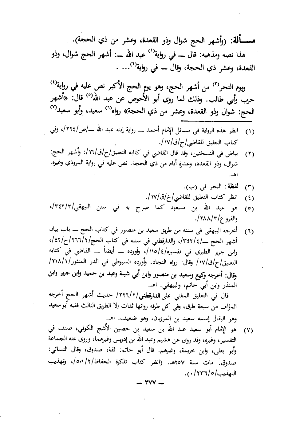هَذَا نَصُّهُ وَمَذْهَبُهُ قَالَ فِي رِوَايَةِ عَبْدِ اللَّهِ: أَشْهُرُ الْحَجِّ: شَوَّالٌ وَذُو الْقَعْدَةِ وَعَشْرُ ذِي الْحِجَّةِ، وَقَالَ فِي رِوَايَةٍ ... .