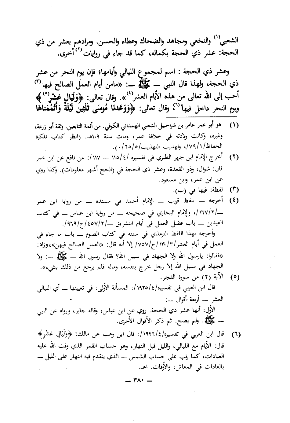 الشَّعْبِيِّ وَالنَّخَعِيِّ وَمُجَاهِدٍ وَالضَّحَّاكِ وَعَطَاءٍ وَالْحَسَنِ، وَمُرَادُهُمْ بِعَشْرٍ مِنْ ذِي الْحِجَّةِ عَشْرُ ذِي الْحِجَّةِ بِكَمَالِهِ، كَمَا قَدْ جَاءَ فِي رِوَايَاتٍ أُخْرَى.