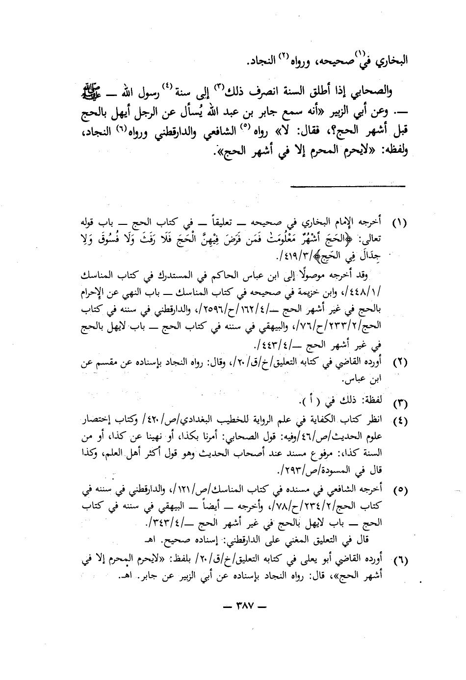 وَالصَّحَابِيُّ إِذَا أَطْلَقَ السُّنَّةَ انْصَرَفَ ذَلِكَ إِلَى سُنَّةِ رَسُولِ اللَّهِ - صَلَّى اللَّهُ عَلَيْهِ وَسَلَّمَ -، وَعَنْ أَبِي الزُّبَيْرِ " أَنَّهُ سَمِعَ جَابِرَ بْنَ عَبْدِ اللَّهِ يُسْأَلُ عَنِ الرَّجُلِ: أَيُهِلُّ بِالْحَجِّ قَبْلَ أَشْهُرِ الْحَجِّ؟ فَقَالَ: لَا " رَوَاهُ الشَّافِعِيُّ وَالدَّارَقُطْنِيُّ وَرَوَاهُ النَّجَّادُ، وَلَفْظُهُ: " لَا يُحْرِمِ الْمُحْرِمُ إِلَّا فِي أَشْهُرِ الْحَجِّ ".