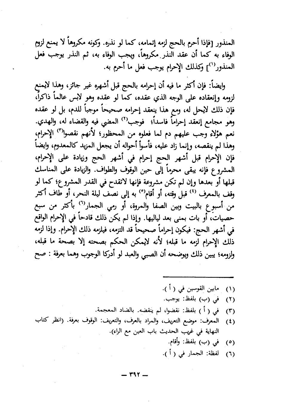 الْمَنْذُورِ [فَإِذَا أَحْرَمَ بِالْحَجِّ لَزِمَهُ إِتْمَامُهُ كَمَا لَوْ نَذَرَهُ، وَكَوْنُهُ مَكْرُوهًا لَا يَمْنَعُ لُزُومَ الْوَفَاءِ بِهِ كَمَا أَنَّ عَقْدَ النَّذْرِ مَكْرُوهًا، وَيَجِبُ الْوَفَاءُ بِهِ، ثُمَّ النَّذْرُ يُوجِبُ فِعْلَ الْمَنْذُورِ] وَكَذَلِكَ الْإِحْرَامُ يُوجِبُ فِعْلَ مَا أَحْرَمَ بِهِ.