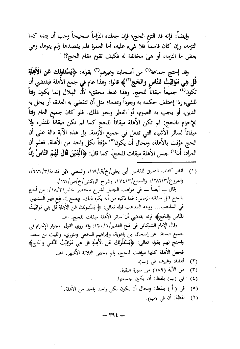 وَقَدِ احْتَجَّ جَمَاعَةٌ مِنْ أَصْحَابِنَا وَغَيْرِهِمْ بِقَوْلِهِ {يَسْأَلُونَكَ عَنِ الْأَهِلَّةِ قُلْ هِيَ مَوَاقِيتُ لِلنَّاسِ وَالْحَجِّ} [البقرة: 189] قَالُوا: وَهَذَا عَامٌّ فِي جَمِيعِ الْأَهِلَّةِ فَيَقْتَضِي أَنْ تَكُونَ جَمِيعًا مِيقَاتًا لِلْحَجِّ، وَهَذَا غَلَطٌ مُحَقَّقٌ؛ لِأَنَّ الْهِلَالَ إِنَّمَا يَكُونُ وَقْتًا لِلشَّيْءِ إِذَا اخْتَلَفَ حُكْمُهُ بِهِ وُجُودًا وَعَدَمًا، مِثْلُ أَنْ تَنْقَضِيَ بِهِ الْعِدَّةُ أَوْ يَحِلَّ بِهِ الدَّيْنُ أَوْ يَجِبَ بِهِ الصَّوْمُ أَوِ الْفِطْرُ وَنَحْوُ ذَلِكَ، فَلَوْ كَانَ جَمِيعُ الْعَامِ وَقْتًا لِلْإِحْرَامِ بِالْحَجِّ لَمْ تَكُنِ الْأَهِلَّةُ مِيقَاتًا لِلْحَجِّ كَمَا لَمْ تَكُنْ مِيقَاتًا لِلنَّذْرِ، وَلَا مِيقَاتًا لِسَائِرِ الْأَشْيَاءِ الَّتِي تُفْعَلُ فِي جَمِيعِ الْأَزْمِنَةِ، بَلْ هَذِهِ الْآيَةُ دَالَّةٌ عَلَى أَنَّ الْحَجَّ مُؤَقَّتٌ بِالْأَهِلَّةِ، وَمُحَالٌ أَنْ يَكُونَ مُؤَقَّتًا بِكُلِّ وَاحِدٍ مِنَ الْأَهِلَّةِ، فَعُلِمَ أَنَّ الْمُرَادَ: أَنَّ جِنْسَ الْأَهِلَّةِ مِيقَاتٌ لِلْحَجِّ كَمَا قَالَ: {الَّذِينَ قَالَ لَهُمُ النَّاسُ إِنَّ النَّاسَ قَدْ جَمَعُوا لَكُمْ} [آل عمران: 173].