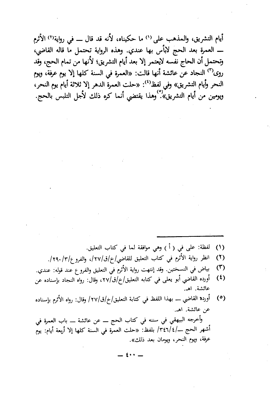 أَيَّامِ التَّشْرِيقِ، وَالْمَذْهَبُ عَلَى مَا حَكَيْنَاهُ؛ لِأَنَّهُ قَدْ قَالَ - فِي رِوَايَةِ الْأَثْرَمِ -: الْعُمْرَةُ بَعْدَ الْحَجِّ لَا بَأْسَ بِهَا عِنْدِي، وَهَذِهِ الرِّوَايَةُ تَحْتَمِلُ مَا قَالَهُ الْقَاضِي، وَتَحْتَمِلُ أَنَّ الْحَاجَّ نَفْسَهُ لَا يَعْتَمِرُ إِلَّا بَعْدَ أَيَّامِ التَّشْرِيقِ؛ لِأَنَّهَا مِنْ تَمَامِ الْحَجِّ، وَقَدْ رَوَى النَّجَّادُ عَنْ عَائِشَةَ أَنَّهَا قَالَتِ: " الْعُمْرَةُ فِي السَّنَةِ كُلِّهَا إِلَّا يَوْمَ عَرَفَةَ وَيَوْمَ النَّحْرِ وَأَيَّامَ التَّشْرِيقِ " وَفِي لَفْظٍ: " حَلَّتِ الْعُمْرَةُ الدَّهْرَ إِلَّا ثَلَاثَةَ أَيَّامٍ يَوْمَ النَّحْرِ، وَيَوْمَيْنِ مِنْ أَيَّامِ التَّشْرِيقِ " وَهَذَا يَقْتَضِي أَنَّمَا كُرِهَ ذَلِكَ لِأَجْلِ التَّلَبُّسِ بِالْحَجِّ.