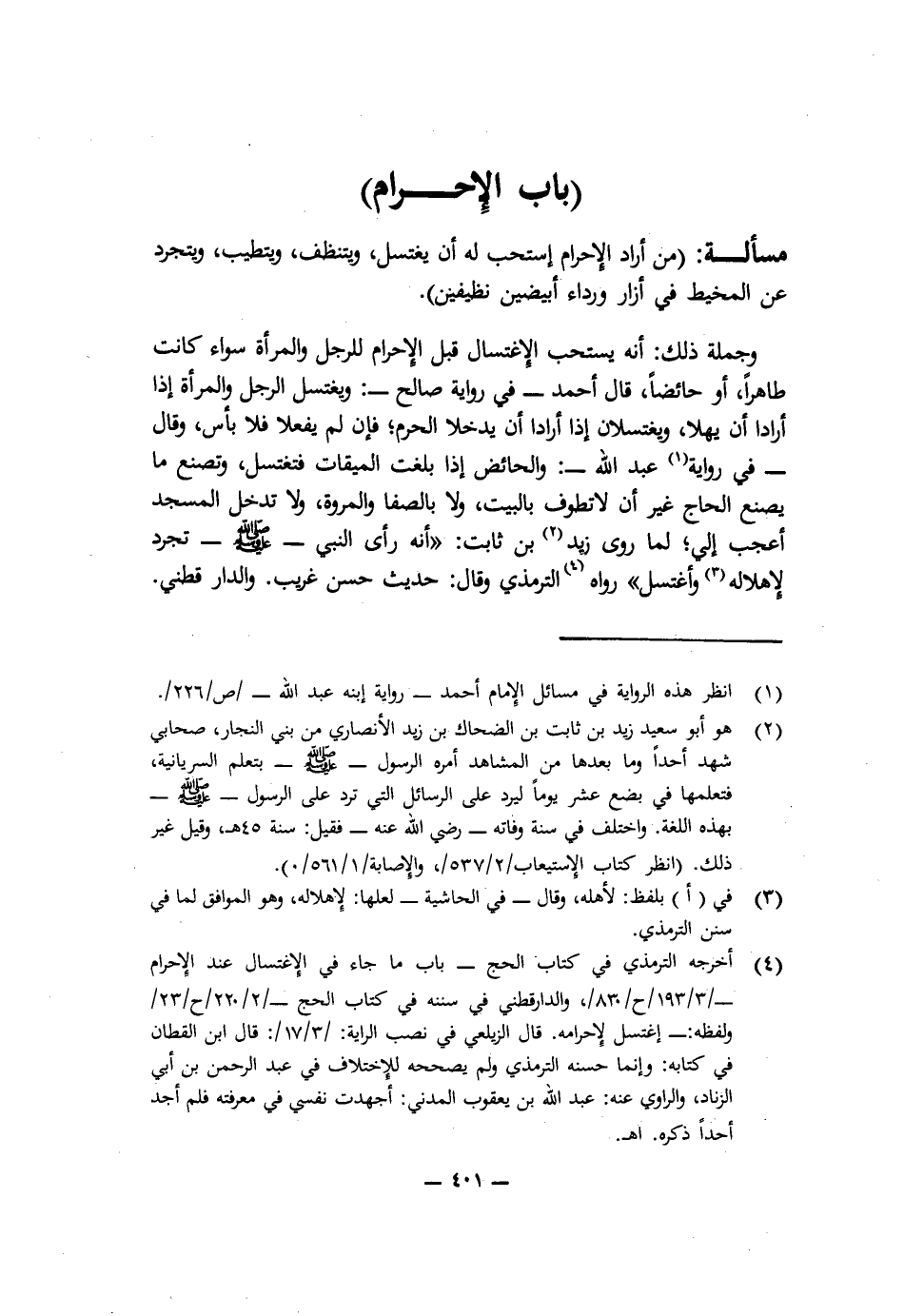 وَجُمْلَةُ ذَلِكَ أَنَّهُ يُسْتَحَبُّ الِاغْتِسَالُ قَبْلَ الْإِحْرَامِ لِلرَّجُلِ وَالْمَرْأَةِ، سَوَاءٌ كَانَتْ طَاهِرًا أَوْ حَائِضًا، قَالَ أَحْمَدُ - فِي رِوَايَةِ صَالِحٍ -: وَيَغْتَسِلُ الرَّجُلُ وَالْمَرْأَةُ إِذَا أَرَادَا أَنْ يُهِلَّا وَيَغْتَسِلَانِ إِذَا أَرَادَا أَنْ يَدْخُلَا الْحَرَمَ؛ فَإِنْ لَمْ يَفْعَلَا فَلَا بَأْسَ، وَقَالَ فِي رِوَايَةِ عَبْدِ اللَّهِ: وَالْحَائِضُ إِذَا بَلَغَتِ الْمِيقَاتَ فَتَغْتَسِلُ وَتَصْنَعُ مَا يَصْنَعُ الْحَاجُّ غَيْرَ أَنْ لَا تَطُوفَ بِالْبَيْتِ وَلَا بِالصَّفَا وَالْمَرْوَةِ وَلَا تَدْخُلَ الْمَسْجِدَ أَعْجَبُ إِلَيَّ؛ لِمَا رَوَى زَيْدُ بْنُ ثَابِتٍ: «أَنَّهُ رَأَى النَّبِيَّ - صَلَّى اللَّهُ عَلَيْهِ وَسَلَّمَ - تَجَرَّدَ لِإِهْلَالِهِ وَاغْتَسَلَ» رَوَاهُ التِّرْمِذِيُّ وَقَالَ: حَدِيثٌ حَسَنٌ غَرِيبٌ، وَالدَّارَقُطْنِيُّ.