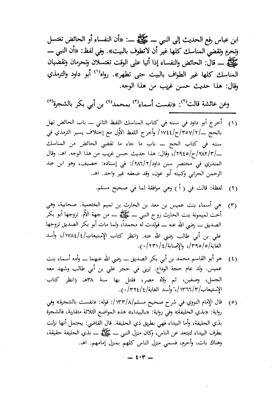 ابْنِ عَبَّاسٍ رَفَعَ الْحَدِيثَ إِلَى النَّبِيِّ - صَلَّى اللَّهُ عَلَيْهِ وَسَلَّمَ -: " «أَنَّ النُّفَسَاءَ أَوِ الْحَائِضَ تَغْتَسِلُ وَتُحْرِمُ وَتَقْضِي الْمَنَاسِكَ كُلَّهَا غَيْرَ أَنْ لَا تَطُوفَ بِالْبَيْتِ» " وَفِي لَفْظٍ: " «أَنَّ النَّبِيَّ - صَلَّى اللَّهُ عَلَيْهِ وَسَلَّمَ - قَالَ: الْحَائِضُ وَالنُّفَسَاءُ إِذَا أَتَيَا عَلَى الْوَقْتِ تَغْتَسِلَانِ وَتُحْرِمَانِ وَتَقْضِيَانِ الْمَنَاسِكَ كُلَّهَا غَيْرَ الطَّوَافِ بِالْبَيْتِ حَتَّى تَطْهُرَ» " رَوَاهُ أَبُو دَاوُدَ وَالتِّرْمِذِيُّ، وَقَالَ: هَذَا حَدِيثٌ حَسَنٌ غَرِيبٌ مِنْ هَذَا الْوَجْهِ.