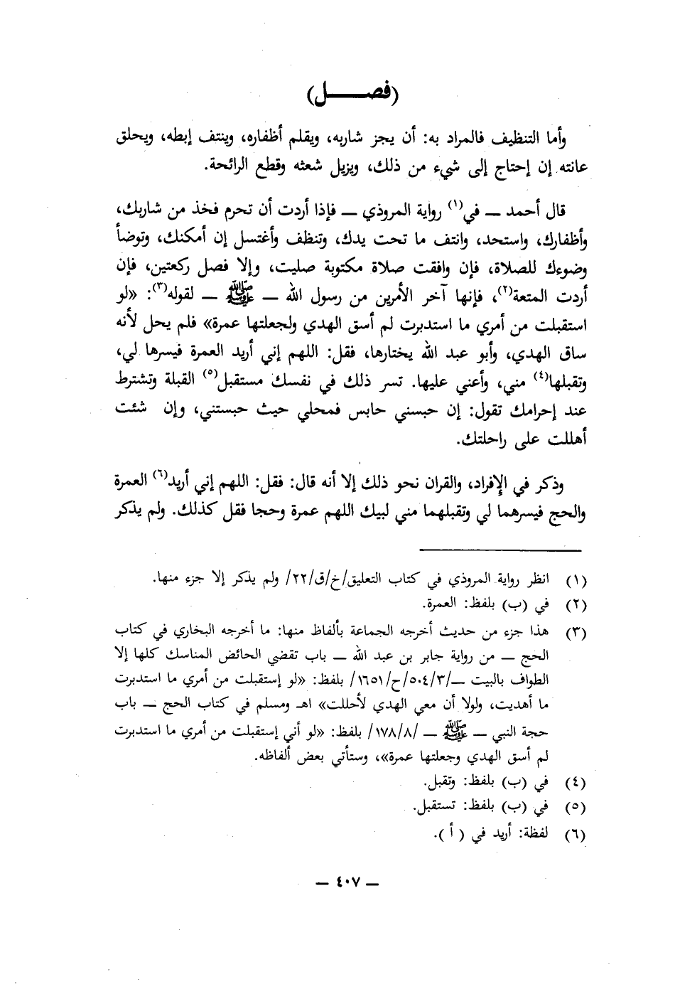 قَالَ أَحْمَدُ - فِي رِوَايَةِ الْمَرُّوذِيِّ - فَإِذَا أَرَدْتَ أَنْ تُحْرِمَ فَخُذْ مِنْ شَارِبِكَ وَأَظْفَارِكَ وَاسْتَحِدَّ وَانْتِفْ مَا تَحْتَ يَدِكَ وَتَنَظَّفْ وَاغْتَسِلْ إِنْ أَمْكَنَكَ، وَتَوَضَّأْ وُضُوءَكَ لِلصَّلَاةِ فَإِنْ وَافَقَتْ صَلَاةً مَكْتُوبَةً صَلَّيْتَ، وَإِلَّا فَصَلِّ رَكْعَتَيْنِ، فَإِنْ أَرَدْتَ الْمُتْعَةَ فَإِنَّهَا آخِرُ الْأَمْرَيْنِ مِنْ رَسُولِ اللَّهِ - صَلَّى اللَّهُ عَلَيْهِ وَسَلَّمَ - لِقَوْلِهِ: («لَوِ اسْتَقْبَلْتُ مِنْ أَمْرِي مَا اسْتَدْبَرْتُ لَمْ أَسُقِ الْهَدْيَ وَلَجَعَلْتُهَا عُمْرَةً») فَلَمْ يَحِلَّ لِأَنَّهُ سَاقَ الْهَدْيَ، وَأَبُو عَبْدِ اللَّهِ يَخْتَارُهَا، فَقُلِ: اللَّهُمَّ إِنِّي أُرِيدُ الْعُمْرَةَ فَيَسِّرْهَا لِي، وَتَقَبَّلْهَا مِنِّي، وَأَعِنِّي عَلَيْهَا، تُسِرُّ ذَلِكَ فِي نَفْسِكَ مُسْتَقْبِلَ الْقِبْلَةِ وَتَشْتَرِطُ عِنْدَ إِحْرَامِكَ تَقُولُ: إِنْ حَبَسَنِي حَابِسٌ فَمَحَلِّي حَيْثُ حَبَسْتَنِي، وَإِنْ شِئْتَ أَهْلَلْتَ عَلَى رَاحِلَتِكَ.
