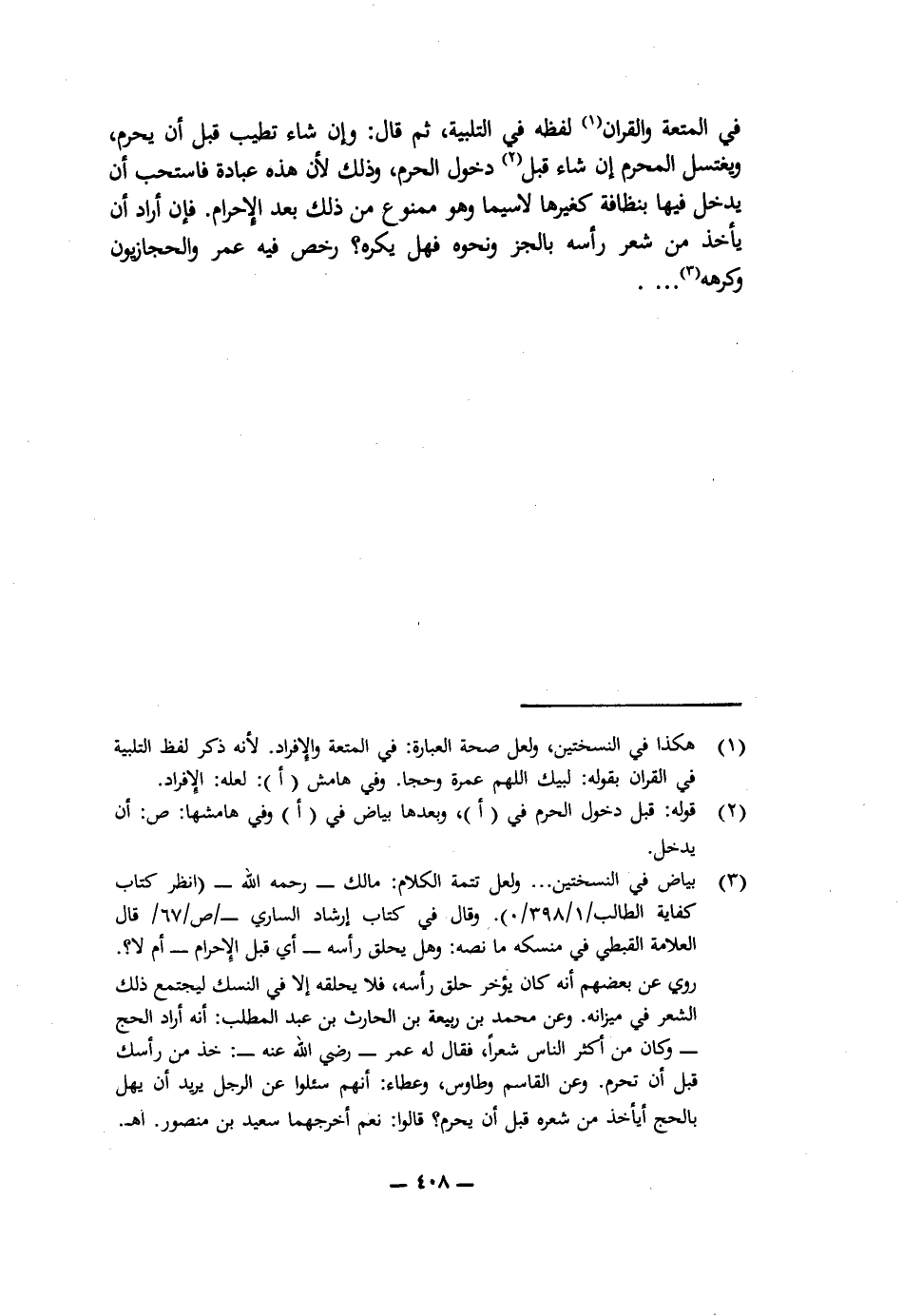 فِي الْمُتْعَةِ وَالْقِرَانِ لَفْظَهُ فِي التَّلْبِيَةِ، ثُمَّ قَالَ: وَإِنْ شَاءَ تَطَيَّبَ قَبْلَ أَنْ يُحْرِمَ، وَيَغْتَسِلُ الْمُحْرِمُ إِنْ شَاءَ قَبْلَ دُخُولِ الْحَرَمِ، وَذَلِكَ لِأَنَّ هَذِهِ عِبَادَةٌ فَاسْتُحِبَّ أَنْ يَدْخُلَ فِيهَا بِنَظَافَةٍ كَغَيْرِهَا، لَا سِيَّمَا وَهُوَ مَمْنُوعٌ مِنْ ذَلِكَ بَعْدَ الْإِحْرَامِ، فَإِنْ أَرَادَ أَنْ يَأْخُذَ مِنْ شَعْرِ رَأْسِهِ بِالْجَزِّ وَنَحْوِهِ فَهَلْ يُكْرَهُ؟ رَخَّصَ فِيهِ عُمَرُ وَالْحِجَازِيُّونَ وَكَرِهَهُ ... .