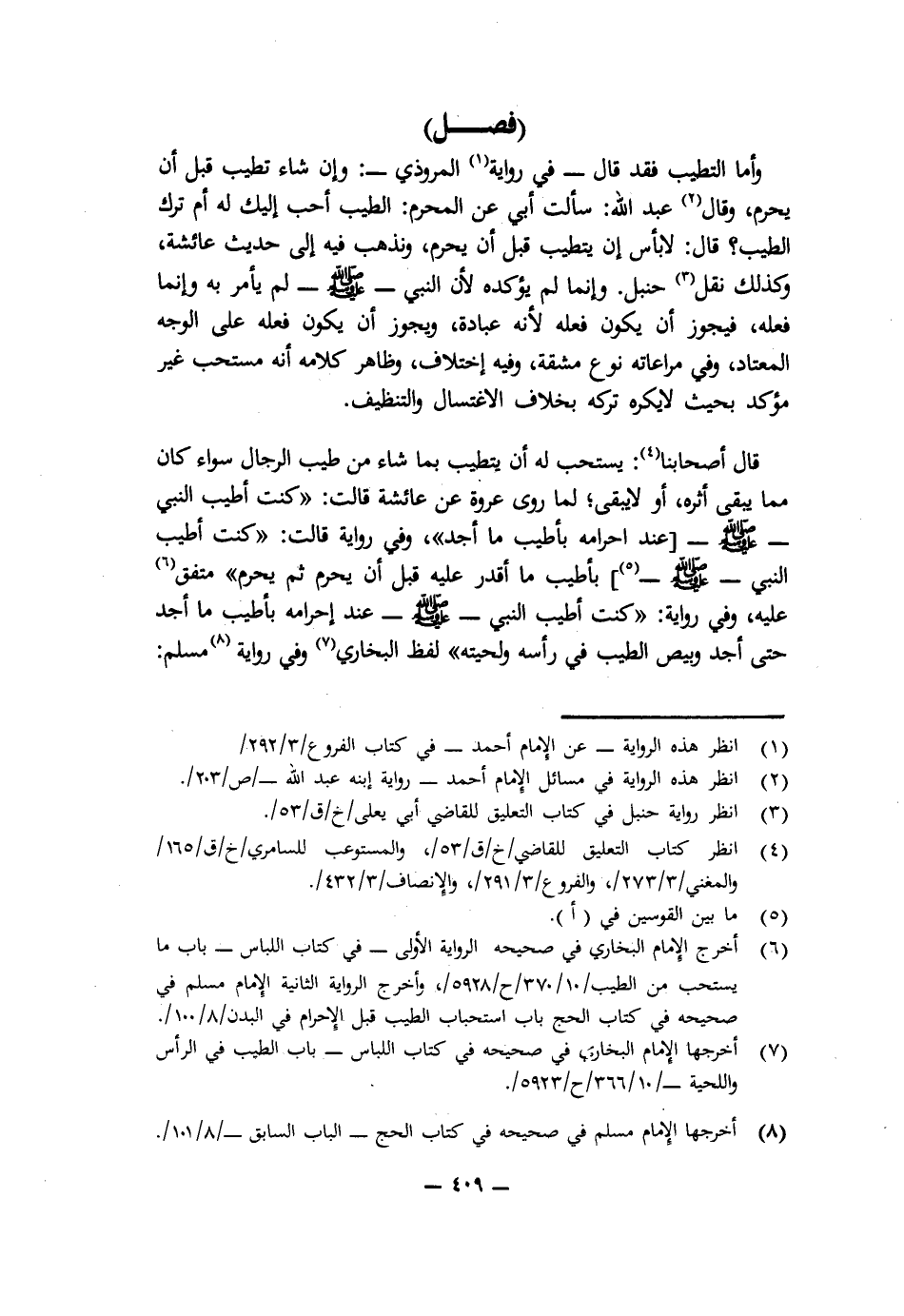 وَأَمَّا التَّطَيُّبُ فَقَدْ قَالَ - فِي رِوَايَةِ الْمَرُّوذِيِّ -: وَإِنْ شَاءَ تَطَيَّبَ قَبْلَ أَنْ يُحْرِمَ، وَقَالَ عَبْدُ اللَّهِ: سَأَلْتُ أَبِي عَنِ الْمُحْرِمِ: الطِّيبُ أَحَبُّ إِلَيْكَ لَهُ أَمْ تَرْكُ الطِّيبِ؟ قَالَ: لَا بَأْسَ أَنْ يَتَطَيَّبَ قَبْلَ أَنْ يُحْرِمَ، وَنَذْهَبُ فِيهِ إِلَى حَدِيثِ عَائِشَةَ، وَكَذَلِكَ نَقَلَ حَنْبَلٌ، وَإِنَّمَا لَمْ يُؤَكِّدْهُ لِأَنَّ النَّبِيَّ - صَلَّى اللَّهُ عَلَيْهِ وَسَلَّمَ - لَمْ يَأْمُرْ بِهِ وَإِنَّمَا فَعَلَهُ، فَيَجُوزُ أَنْ يَكُونَ فَعَلَهُ لِأَنَّهُ عِبَادَةٌ، وَيَجُوزُ أَنْ يَكُونَ فَعَلَهُ عَلَى الْوَجْهِ الْمُعْتَادِ، وَفِي مُرَاعَاتِهِ نَوْعُ مَشَقَّةٍ وَفِيهِ اخْتِلَافٌ، وَظَاهِرُ كَلَامِهِ أَنَّهُ مُسْتَحَبٌّ غَيْرُ مُؤَكَّدٍ بِحَيْثُ لَا يُكْرَهُ تَرْكُهُ بِخِلَافِ الِاغْتِسَالِ وَالتَّنْظِيفِ.