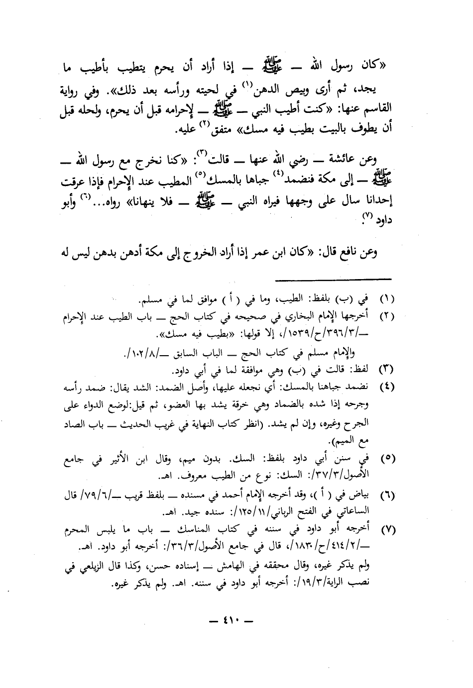 «كَانَ رَسُولُ اللَّهِ - صَلَّى اللَّهُ عَلَيْهِ وَسَلَّمَ - إِذَا أَرَادَ أَنْ يُحْرِمَ يَتَطَيَّبُ بِأَطْيَبِ مَا يَجِدُ، ثُمَّ أَرَى وَبِيصَ الدُّهْنِ فِي لِحْيَتِهِ وَرَأْسِهِ بَعْدَ ذَلِكَ " وَفِي رِوَايَةِ الْقَاسِمِ عَنْهَا: " كُنْتُ أُطَيِّبُ النَّبِيَّ - صَلَّى اللَّهُ عَلَيْهِ وَسَلَّمَ - لِإِحْرَامِهِ قَبْلَ أَنْ يُحْرِمَ، وَلِحِلِّهِ قَبْلَ أَنْ يَطُوفَ بِالْبَيْتِ بِطِيبٍ فِيهِ مِسْكٌ» مُتَّفَقٌ عَلَيْهِ.