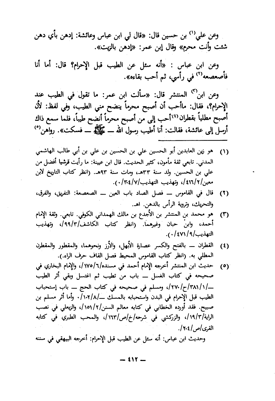 وَعَنِ ابْنِ عَبَّاسٍ: " أَنَّهُ سُئِلَ عَنِ الطِّيبِ قَبْلَ الْإِحْرَامِ؟ قَالَ: أَمَّا أَنَا فَأُصَعْصِعُهُ فِي رَأْسِي، ثُمَّ أُحِبُّ بَقَاءَهُ ".