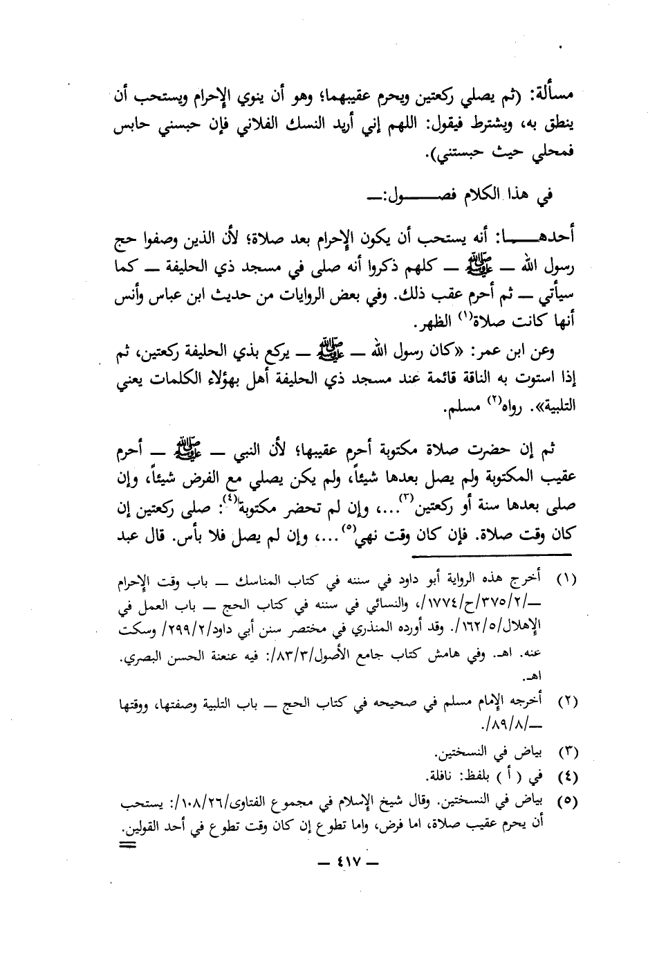 مَسْأَلَةٌ: (ثُمَّ يُصَلِّي رَكْعَتَيْنِ وَيُحْرِمُ عَقِيبَهُمَا؛ وَهُوَ أَنْ يَنْوِيَ الْإِحْرَامَ وَيُسْتَحَبُّ أَنْ يَنْطِقَ بِهِ وَيَشْتَرِطَ فَيَقُولَ: اللَّهُمَّ إِنِّي أُرِيدُ النُّسُكَ الْفُلَانِيَّ فَإِنْ حَبَسَنِي حَابِسٌ فَمَحَلِّي حَيْثُ حَبَسْتَنِي).