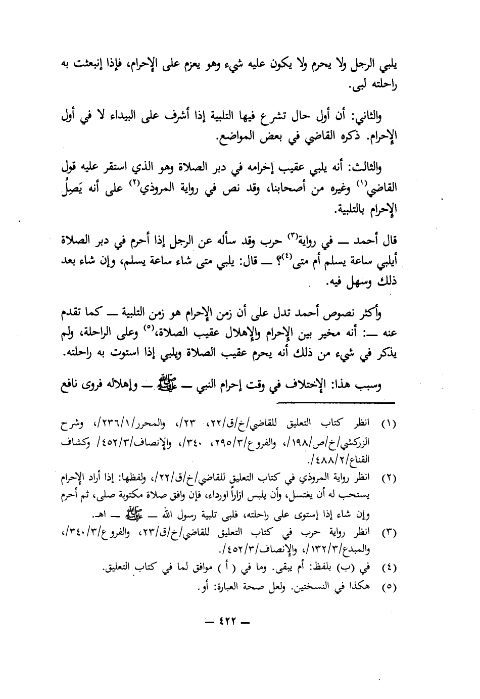 وَأَكْثَرُ نُصُوصِ أَحْمَدَ تَدُلُّ عَلَى أَنَّ زَمَنَ الْإِحْرَامِ هُوَ زَمَنُ التَّلْبِيَةِ - كَمَا تَقَدَّمَ عَنْهُ -: أَنَّهُ مُخَيَّرٌ بَيْنَ الْإِحْرَامِ وَالْإِهْلَالِ عَقِيبَ الصَّلَاةِ، وَعَلَى الرَّاحِلَةِ وَلَمْ يَذْكُرْ فِي شَيْءٍ مِنْ ذَلِكَ أَنَّهُ يُحْرِمُ عَقِيبَ الصَّلَاةِ وَيُلَبِّي إِذَا اسْتَوَتْ بِهِ رَاحِلَتُهُ.