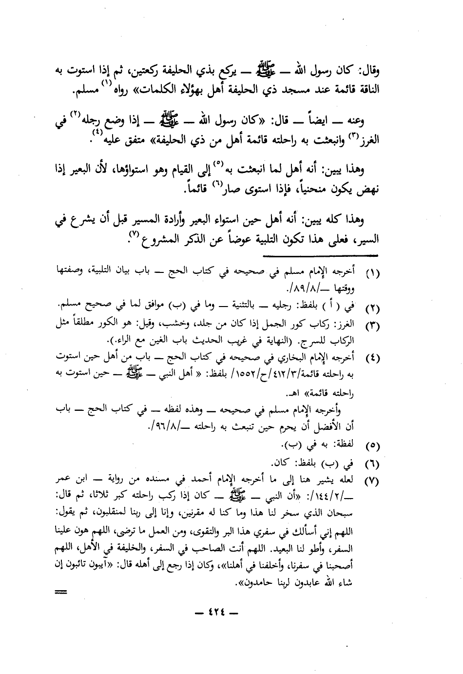 وَقَالَ: كَانَ رَسُولُ اللَّهِ - صَلَّى اللَّهُ عَلَيْهِ وَسَلَّمَ - يَرْكَعُ بِذِي الْحُلَيْفَةِ رَكْعَتَيْنِ، ثُمَّ إِذَا اسْتَوَتْ بِهِ النَّاقَةُ قَائِمَةً عِنْدَ مَسْجِدِ ذِي الْحُلَيْفَةِ أَهَلَّ بِهَؤُلَاءِ الْكَلِمَاتِ» رَوَاهُ مُسْلِمٌ.