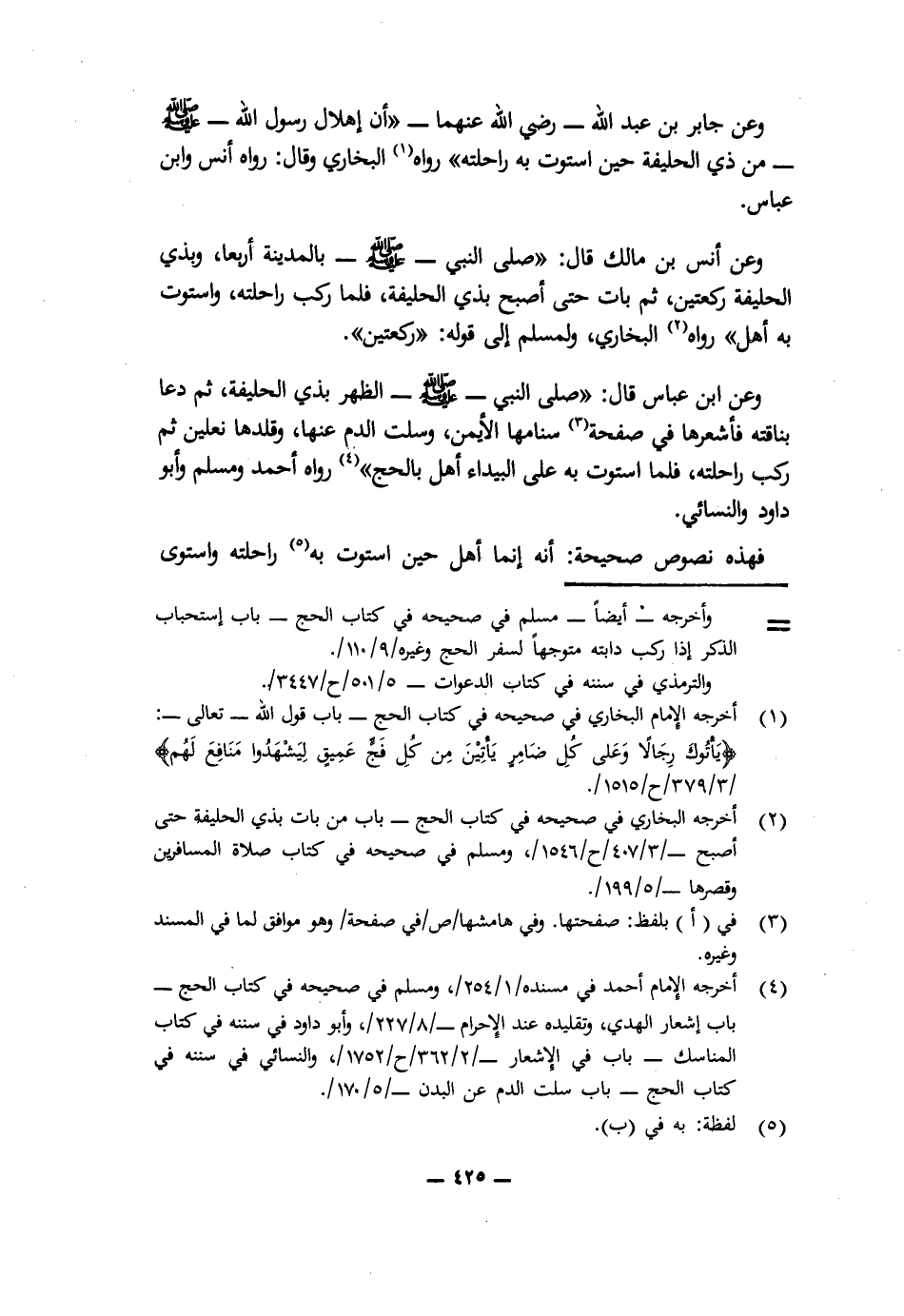 فَهَذِهِ نُصُوصٌ صَحِيحَةٌ أَنَّهُ إِنَّمَا أَهَلَّ حِينَ اسْتَوَتْ بِهِ رَاحِلَتُهُ وَاسْتَوَى