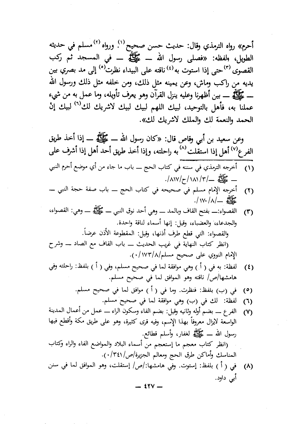 أَحْرَمَ» رَوَاهُ التِّرْمِذِيُّ وَقَالَ: حَدِيثٌ حَسَنٌ صَحِيحٌ، وَرَوَاهُ مُسْلِمٌ فِي حَدِيثِهِ الطَّوِيلِ، وَلَفْظُهُ: «فَصَلَّى رَسُولُ اللَّهِ - صَلَّى اللَّهُ عَلَيْهِ وَسَلَّمَ - فِي الْمَسْجِدِ، ثُمَّ رَكِبَ الْقُصْوَى، حَتَّى إِذَا اسْتَوَتْ بِهِ نَاقَتُهُ عَلَى الْبَيْدَاءِ نَظَرْتُ إِلَى مَدِّ بَصَرِي بَيْنَ يَدَيْهِ مِنْ رَاكِبٍ وَمَاشٍ، وَعَنْ يَمِينِهِ مِثْلَ ذَلِكَ، وَمِنْ خَلْفِهِ مِثْلَ ذَلِكَ، وَرَسُولُ اللَّهِ - صَلَّى اللَّهُ عَلَيْهِ وَسَلَّمَ - بَيْنَ أَظْهُرِنَا وَعَلَيْهِ يَنْزِلُ الْقُرْآنُ وَهُوَ يَعْرِفُ تَأْوِيلَهُ، وَمَا عَمِلَ بِهِ مِنْ شَيْءٍ عَمِلْنَا بِهِ، فَأَهَلَّ بِالتَّوْحِيدِ لَبَّيْكَ اللَّهُمَّ لَبَّيْكَ لَبَّيْكَ لَا شَرِيكَ لَكَ لَبَّيْكَ إِنَّ الْحَمْدَ وَالنِّعْمَةَ لَكَ وَالْمُلْكَ لَا شَرِيكَ لَكَ ".