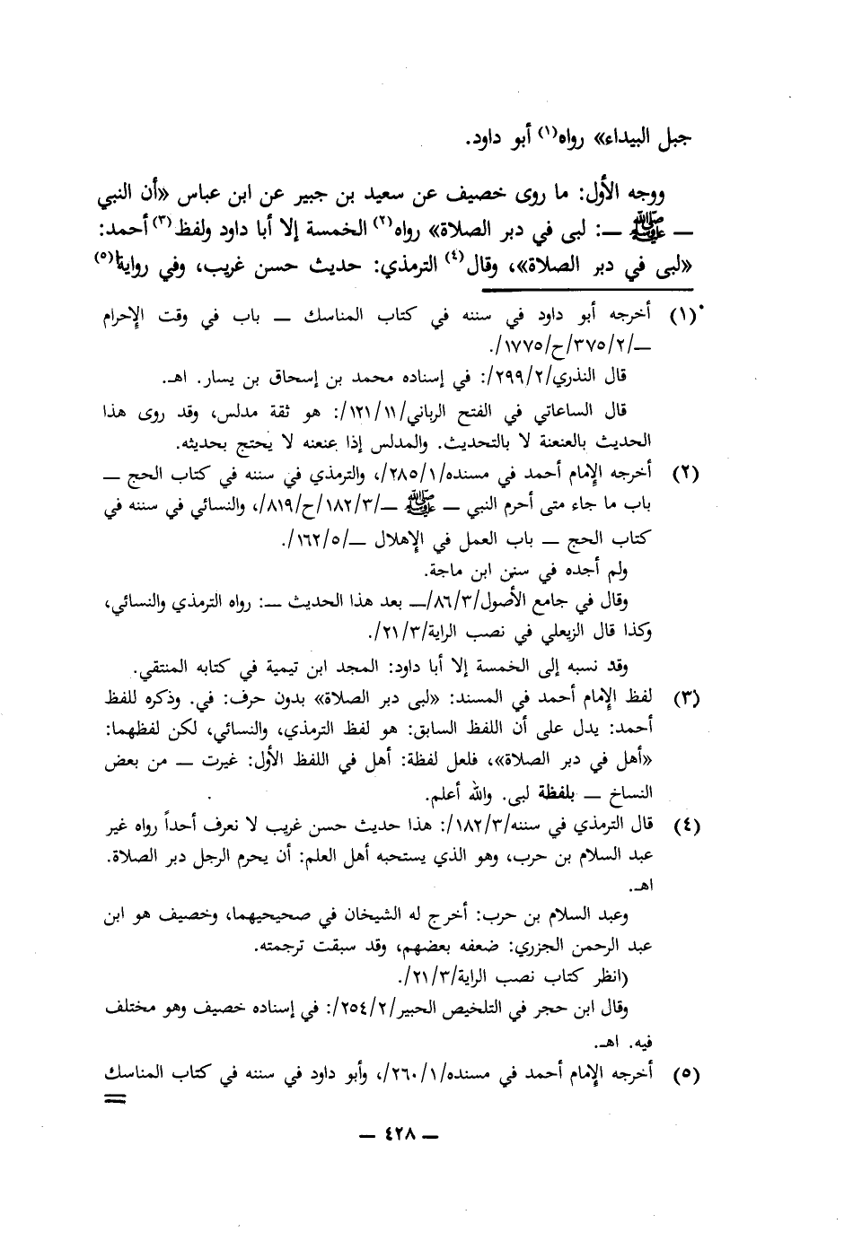 وَوَجْهُ الْأَوَّلِ مَا رَوَى خُصَيْفٌ عَنْ سَعِيدِ بْنِ جُبَيْرٍ عَنِ ابْنِ عَبَّاسٍ «أَنَّ النَّبِيَّ - صَلَّى اللَّهُ عَلَيْهِ وَسَلَّمَ - لَبَّى فِي دُبُرِ الصَّلَاةِ» رَوَاهُ الْخَمْسَةُ إِلَّا أَبَا دَاوُدَ، وَلَفْظُ أَحْمَدَ: «لَبَّى فِي دُبُرِ الصَّلَاةِ» وَقَالَ التِّرْمِذِيُّ: حَدِيثٌ حَسَنٌ غَرِيبٌ، وَفِي رِوَايَةٍ