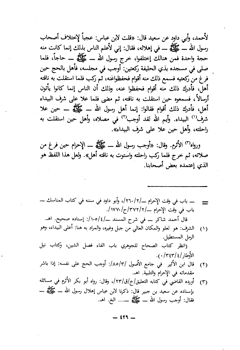 لِأَحْمَدَ وَأَبِي دَاوُدَ عَنْ سَعِيدٍ قَالَ: " «قُلْتُ لِابْنِ عَبَّاسٍ: عَجَبًا لِاخْتِلَافِ أَصْحَابِ رَسُولِ اللَّهِ - صَلَّى اللَّهُ عَلَيْهِ وَسَلَّمَ - فِي إِهْلَالِهِ، فَقَالَ: إِنِّي لَأَعْلَمُ النَّاسِ بِذَلِكَ إِنَّمَا كَانَتْ مِنْهُ حَجَّةٌ وَاحِدَةٌ فَمِنْ هُنَالِكَ اخْتَلَفُوا، خَرَجَ رَسُولُ اللَّهِ - صَلَّى اللَّهُ عَلَيْهِ وَسَلَّمَ - حَاجًّا فَلَمَّا صَلَّى فِي مَسْجِدِهِ بِذِي الْحُلَيْفَةِ رَكْعَتَيْنِ أَوْجَبَ فِي مَجْلِسِهِ، فَأَهَلَّ بِالْحَجِّ حِينَ فَرَغَ مِنْ رَكْعَتَيْهِ فَسَمِعَ ذَلِكَ مِنْهُ أَقْوَامٌ، فَحَفِظُوا عَنْهُ، ثُمَّ رَكِبَ فَلَمَّا اسْتَقَلَّتْ بِهِ نَاقَتُهُ أَهَلَّ، فَأَدْرَكَ ذَلِكَ مِنْهُ أَقْوَامٌ فَحَفِظُوا عَنْهُ، وَذَلِكَ أَنَّ النَّاسَ إِنَّمَا كَانُوا يَأْتُونَ أَرْسَالًا فَسَمِعُوهُ حِينَ اسْتَقَلَّتْ بِهِ نَاقَتُهُ ثُمَّ مَضَى فَلَمَّا عَلَا عَلَى شَرَفِ الْبَيْدَاءِ أَهَلَّ، فَأَدْرَكَ ذَلِكَ أَقْوَامٌ فَقَالُوا: إِنَّمَا أَهَلَّ رَسُولُ اللَّهِ - صَلَّى اللَّهُ عَلَيْهِ وَسَلَّمَ - حِينَ عَلَا شَرَفَ الْبَيْدَاءِ، وَايْمُ اللَّهِ لَقَدْ أَوْجَبَ فِي مُصَلَّاهُ وَأَهَلَّ حِينَ اسْتَقَلَّتْ بِهِ رَاحِلَتُهُ، وَأَهَلَّ حِينَ عَلَا عَلَى شَرَفِ الْبَيْدَاءِ» ".