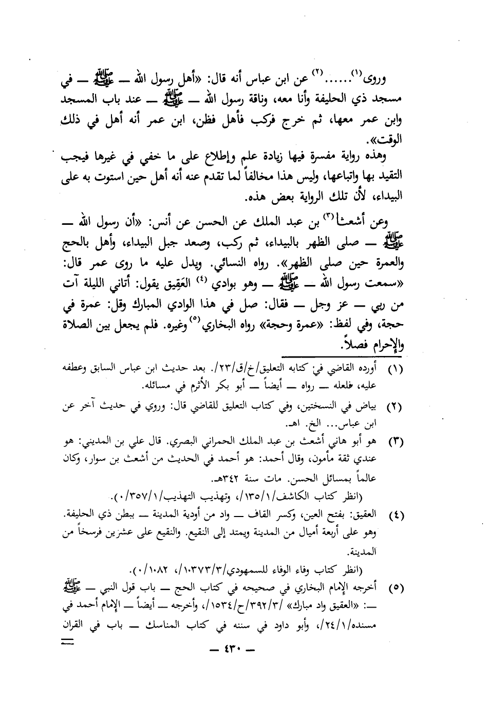 وَرَوَى .... عَنِ ابْنِ عَبَّاسٍ أَنَّهُ قَالَ: «أَهَلَّ رَسُولُ اللَّهِ - صَلَّى اللَّهُ عَلَيْهِ وَسَلَّمَ - فِي مَسْجِدِ ذِي الْحُلَيْفَةِ وَأَنَا مَعَهُ، وَنَاقَةُ رَسُولِ اللَّهِ - صَلَّى اللَّهُ عَلَيْهِ وَسَلَّمَ - عِنْدَ بَابِ الْمَسْجِدِ وَابْنُ عُمَرَ مَعَهَا، ثُمَّ خَرَجَ فَرَكِبَ فَأَهَلَّ فَظَنَّ ابْنُ عُمَرَ أَنَّهُ أَهَلَّ فِي ذَلِكَ الْوَقْتِ».