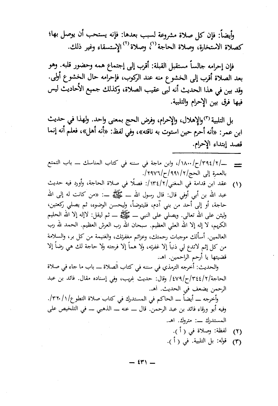 بَلِ التَّلْبِيَةُ وَالْإِهْلَالُ وَالْإِحْرَامُ وَفَرْضُ الْحَجِّ بِمَعْنًى وَاحِدٍ، وَلِهَذَا فِي حَدِيثِ ابْنِ عُمَرَ: «أَنَّهُ أَحْرَمَ حِينَ اسْتَوَتْ بِهِ نَاقَتُهُ " وَفِي لَفْظٍ: " أَنَّهُ أَهَلَّ» فَعُلِمَ أَنَّهُ إِنَّمَا قَصَدَ ابْتِدَاءَ الْإِحْرَامِ.