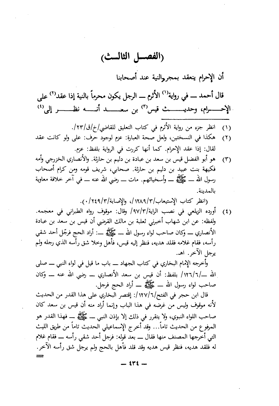 قَالَ أَحْمَدُ - فِي رِوَايَةِ الْأَثْرَمِ - الرَّجُلُ يَكُونُ مُحْرِمًا بِالنِّيَّةِ إِذَا عَقَدَ عَلَى الْإِحْرَامِ، وَحَدِيثُ قَيْسِ بْنِ سَعْدٍ أَنَّهُ نَظَرَ إِلَى