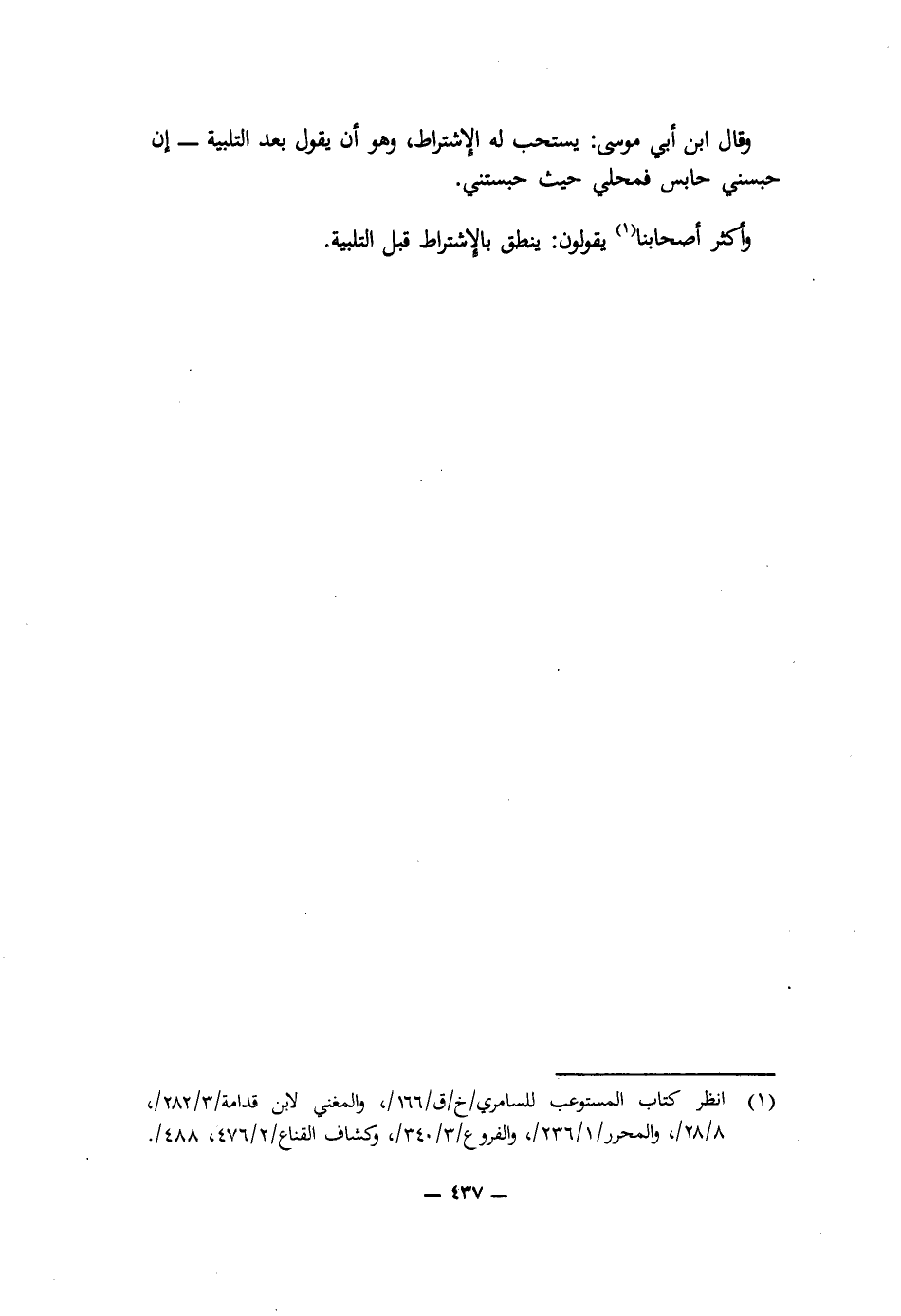 وَقَالَ ابْنُ أَبِي مُوسَى: يُسْتَحَبُّ لَهُ الِاشْتِرَاطُ، وَهُوَ أَنْ يَقُولَ بَعْدَ التَّلْبِيَةِ: إِنْ حَبَسَنِي حَابِسٌ فَمَحَلِّي حَيْثُ حَبَسْتَنِي.