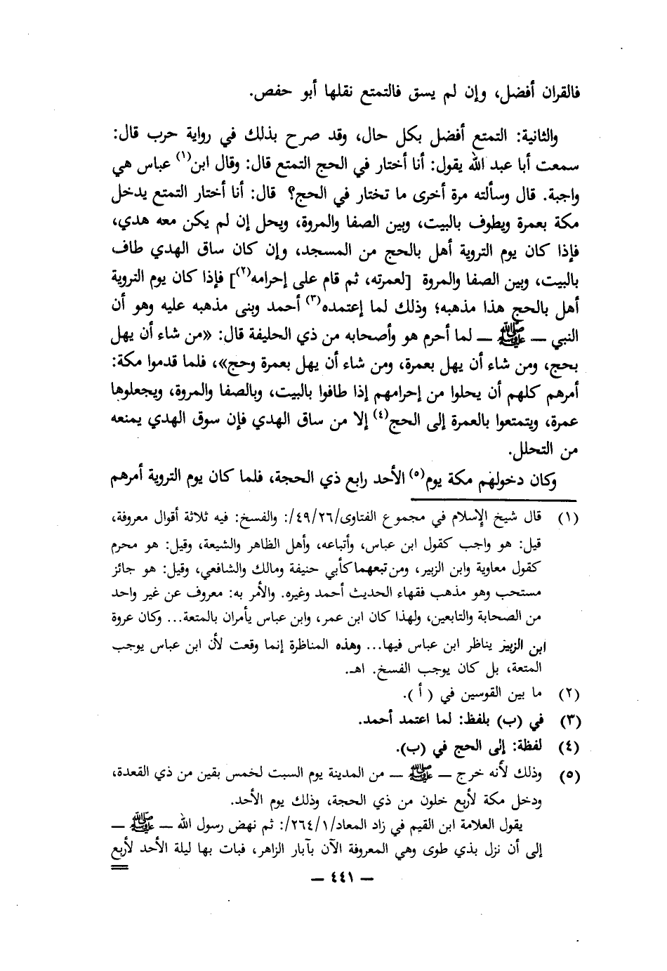 وَالثَّانِيَةُ: التَّمَتُّعُ أَفْضَلُ بِكُلِّ حَالٍ، وَقَدْ صَرَّحَ بِذَلِكَ فِي رِوَايَةِ حَرْبٍ قَالَ: سَمِعْتُ أَبَا عَبْدِ اللَّهِ يَقُولُ: أَنَا أَخْتَارُ فِي الْحَجِّ التَّمَتُّعَ قَالَ: وَقَالَ ابْنُ عَبَّاسٍ هِيَ وَاجِبَةٌ، قَالَ: وَسَأَلْتُهُ مَرَّةً أُخْرَى مَا تَخْتَارُ فِي الْحَجِّ؟ قَالَ: أَنَا أَخْتَارُ التَّمَتُّعَ يَدْخُلُ مَكَّةَ بِعُمْرَةٍ وَيَطُوفُ بِالْبَيْتِ، وَبَيْنَ الصَّفَا وَالْمَرْوَةِ، وَيَحِلُّ إِنْ لَمْ يَكُنْ مَعَهُ هَدْيٌ، فَإِذَا كَانَ يَوْمُ التَّرْوِيَةِ أَهَلَّ بِالْحَجِّ مِنَ الْمَسْجِدِ، وَإِنْ كَانَ سَاقَ الْهَدْيَ طَافَ بِالْبَيْتِ وَبَيْنَ الصَّفَا وَالْمَرْوَةِ [لِعُمْرَتِهِ ثُمَّ قَامَ عَلَى إِحْرَامِهِ] فَإِذَا كَانَ يَوْمُ التَّرْوِيَةِ أَهَلَّ بِالْحَجِّ هَذَا مَذْهَبُهُ؛ وَذَلِكَ لِمَا اعْتَمَدَهُ أَحْمَدُ وَبَنَى مَذْهَبَهُ عَلَيْهِ وَهُوَ «أَنَّ النَّبِيَّ - صَلَّى اللَّهُ عَلَيْهِ وَسَلَّمَ - لَمَّا أَحْرَمَ هُوَ وَأَصْحَابُهُ مِنْ ذِي الْحُلَيْفَةِ قَالَ: " مَنْ شَاءَ أَنْ يُهِلَّ بِحَجٍّ، وَمَنْ شَاءَ أَنْ يُهِلَّ بِعُمْرَةٍ، وَمَنْ شَاءَ أَنْ يُهِلَّ بِعُمْرَةٍ وَحَجٍّ " فَلَمَّا قَدِمُوا مَكَّةَ: أَمَرَهُمْ كُلَّهُمْ أَنْ يَحِلُّوا مِنْ إِحْرَامِهِمْ إِذَا طَافُوا بِالْبَيْتِ وَبِالصَّفَا وَالْمَرْوَةِ، وَيَجْعَلُوهَا عُمْرَةً، وَيَتَمَتَّعُوا بِالْعُمْرَةِ إِلَى الْحَجِّ إِلَّا مَنْ سَاقَ الْهَدْيَ فَإِنَّ سَوْقَ الْهَدْيِ يَمْنَعُهُ مِنَ التَّحَلُّلِ».