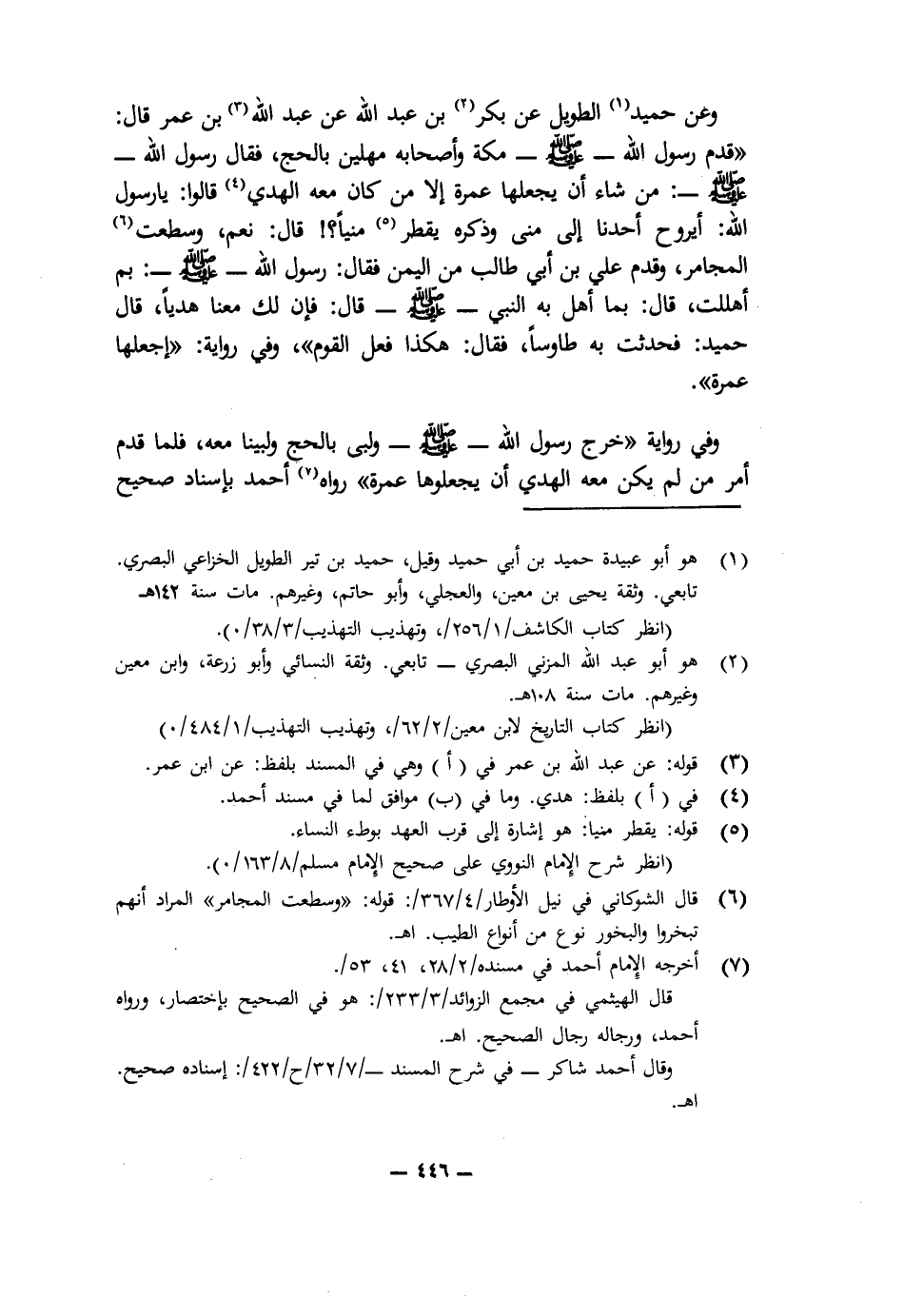 وَعَنْ حُمَيْدٍ الطَّوِيلِ عَنْ بَكْرِ بْنِ عَبْدِ اللَّهِ عَنْ عَبْدِ اللَّهِ بْنِ عُمَرَ قَالَ: («قَدِمَ رَسُولُ اللَّهِ - صَلَّى اللَّهُ عَلَيْهِ وَسَلَّمَ - مَكَّةَ وَأَصْحَابُهُ مُهِلِّينَ بِالْحَجِّ، فَقَالَ رَسُولُ اللَّهِ - صَلَّى اللَّهُ عَلَيْهِ وَسَلَّمَ -: مَنْ شَاءَ أَنْ يَجْعَلَهَا عُمْرَةً إِلَّا مَنْ كَانَ مَعَهُ الْهَدْيُ، قَالُوا: يَا رَسُولَ اللَّهِ أَيَرُوحُ أَحَدُنَا إِلَى مِنًى وَذَكَرُهُ يَقْطُرُ مَنِيًّا؟! قَالَ: نَعَمْ، وَسَطَعَتِ الْمَجَامِرُ، وَقَدِمَ عَلِيُّ بْنُ أَبِي طَالِبٍ مِنَ الْيَمَنِ فَقَالَ رَسُولُ اللَّهِ - صَلَّى اللَّهُ عَلَيْهِ وَسَلَّمَ -: بِمَ أَهْلَلْتَ؟ قَالَ: بِمَا أَهَلَّ بِهِ النَّبِيُّ - صَلَّى اللَّهُ عَلَيْهِ وَسَلَّمَ -، قَالَ: فَإِنَّ لَكَ مَعَنَا هَدْيًا»، قَالَ حُمَيْدٌ: فَحَدَّثْتُ بِهِ طَاوُسًا فَقَالَ: هَكَذَا فَعَلَ الْقَوْمُ) وَفِي رِوَايَةٍ: " «اجْعَلْهَا عُمْرَةً» ".