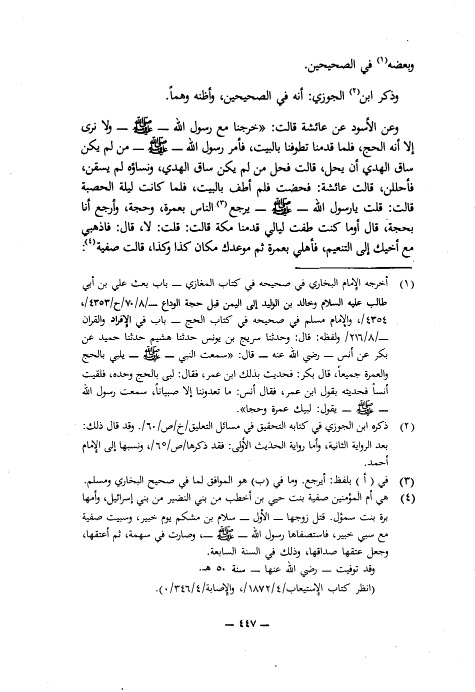 وَعَنِ الْأَسْوَدِ عَنْ عَائِشَةَ قَالَتْ: " «خَرَجْنَا مَعَ رَسُولِ اللَّهِ - صَلَّى اللَّهُ عَلَيْهِ وَسَلَّمَ - وَلَا نُرَى إِلَّا أَنَّهُ الْحَجُّ، فَلَمَّا قَدِمْنَا تَطَوَّفْنَا بِالْبَيْتِ، فَأَمَرَ رَسُولُ اللَّهِ - صَلَّى اللَّهُ عَلَيْهِ وَسَلَّمَ - مَنْ لَمْ يَكُنْ سَاقَ الْهَدْيَ أَنْ يَحِلَّ، قَالَتْ: فَحَلَّ مَنْ لَمْ يَكُنْ سَاقَ الْهَدْيَ، وَنِسَاؤُهُ لَمْ يَسُقْنَ فَأَحْلَلْنَ، قَالَتْ عَائِشَةُ: فَحِضْتُ فَلَمْ أَطُفْ بِالْبَيْتِ، فَلَمَّا كَانَتْ لَيْلَةُ الْحَصْبَةِ قَالَتْ: قُلْتُ: يَا رَسُولَ اللَّهِ - صَلَّى اللَّهُ عَلَيْهِ وَسَلَّمَ -، يَرْجِعُ النَّاسُ بِعُمْرَةٍ وَحَجَّةٍ وَأَرْجِعُ أَنَا بِحَجَّةٍ، قَالَ: أَوَمَا كُنْتِ طُفْتِ لَيَالِيَ قَدِمْنَا مَكَّةَ، قَالَتْ: قُلْتُ: لَا، قَالَ: فَاذْهَبِي مَعَ أَخِيكِ إِلَى التَّنْعِيمِ فَأَهِلِّي بِعُمْرَةٍ ثُمَّ مَوْعِدُكُ مَكَانَ كَذَا وَكَذَا، قَالَتْ صَفِيَّةُ: